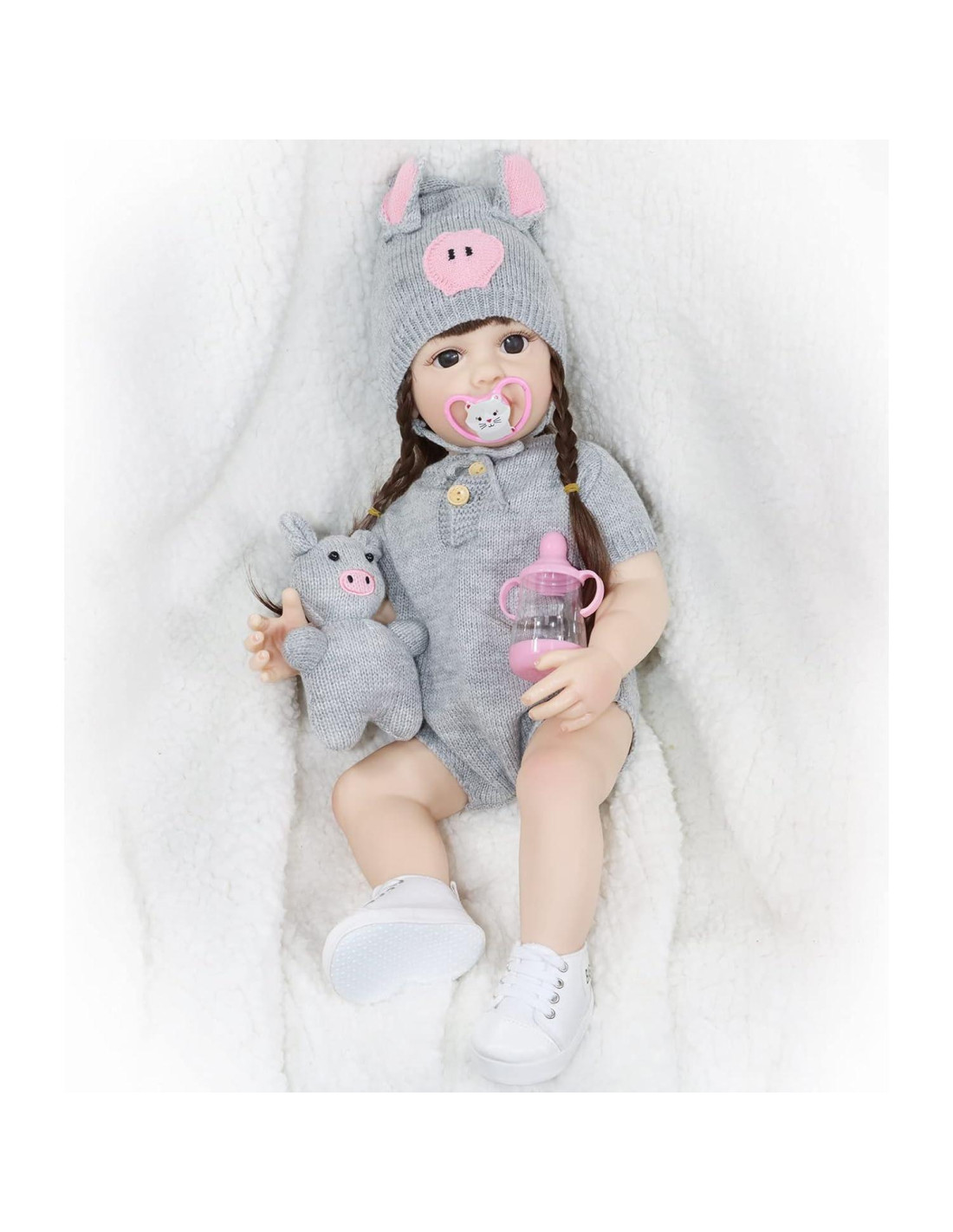 - Accesorios de muñeca real: La ropa de las muñecas de bebé de la vida real está hecha de algodón PP y poliéster. Conjunto de punto gris y gorro a juego, zapatos de lona blancos - la ropa y los accesorios para el cabello de la muñeca reborn se ponen y quitan fácilmente. También puedes comprarle ropa para vestirla.