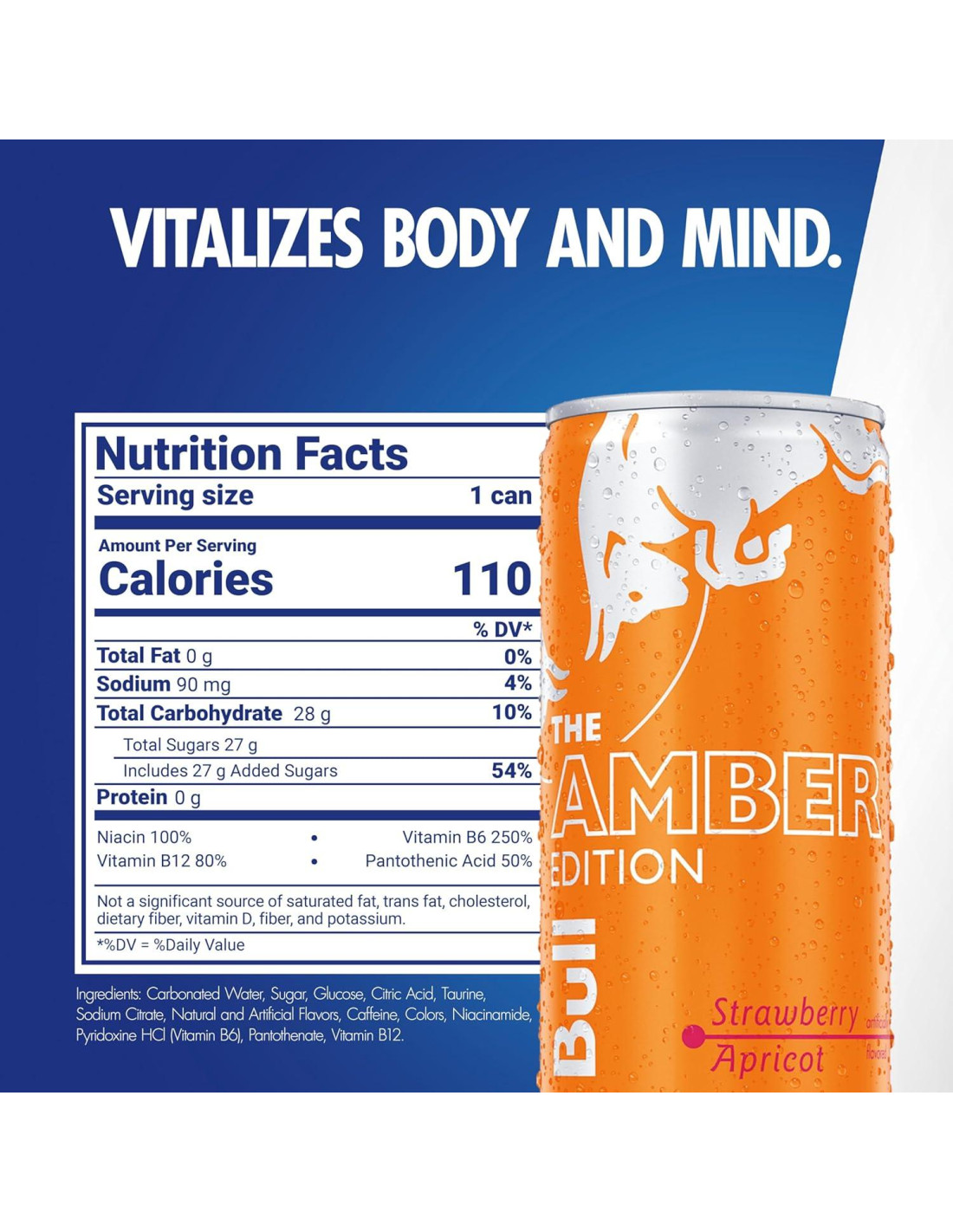 - Disfruta del sabor de Fresa y Albaricoque con un toque de Durazno en la Edición Ámbar de Red Bull; Presenta taurina, un aminoácido, más cuatro vitaminas esenciales del grupo B B3, B6, B12 y B5, que contribuyen al metabolismo energético normal