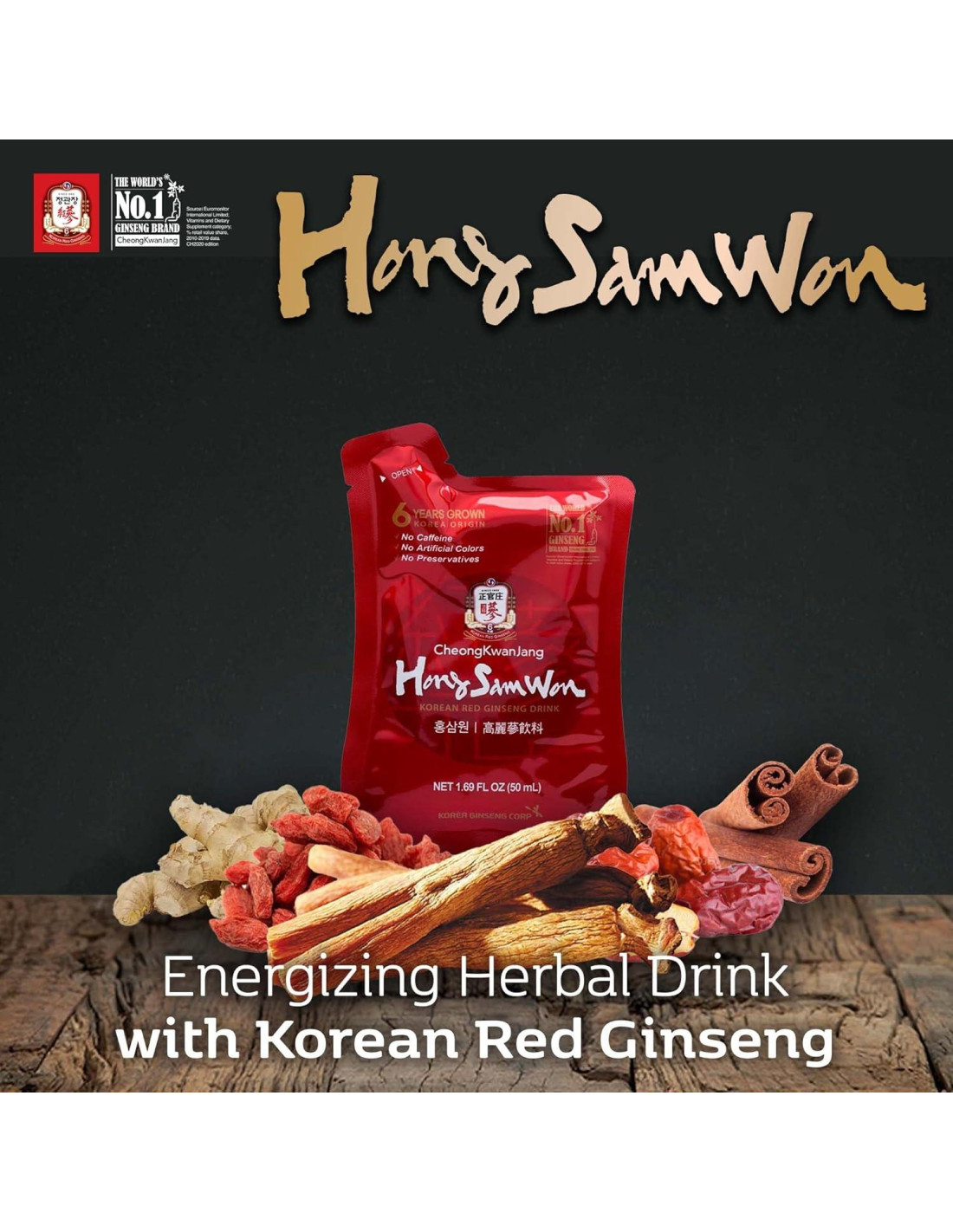 - ¿Buscas un impulso de energía que no te deje nervioso? ¿Sabes qué es mejor que una taza de café? Un sorbo de HONG SAM WON con un lado de energía. Esta es una bebida energizante sin cafeína hecha de extracto de ginseng rojo coreano cultivado durante 6 años, fruta de jujube, canela y jengibre. Tiene un sabor ligero y refrescante que se puede disfrutar en cualquier momento del día. Esta bebida de mezcla herbal natural te dará el impulso que necesitas para seguir adelante en el trabajo, en casa o en el juego.