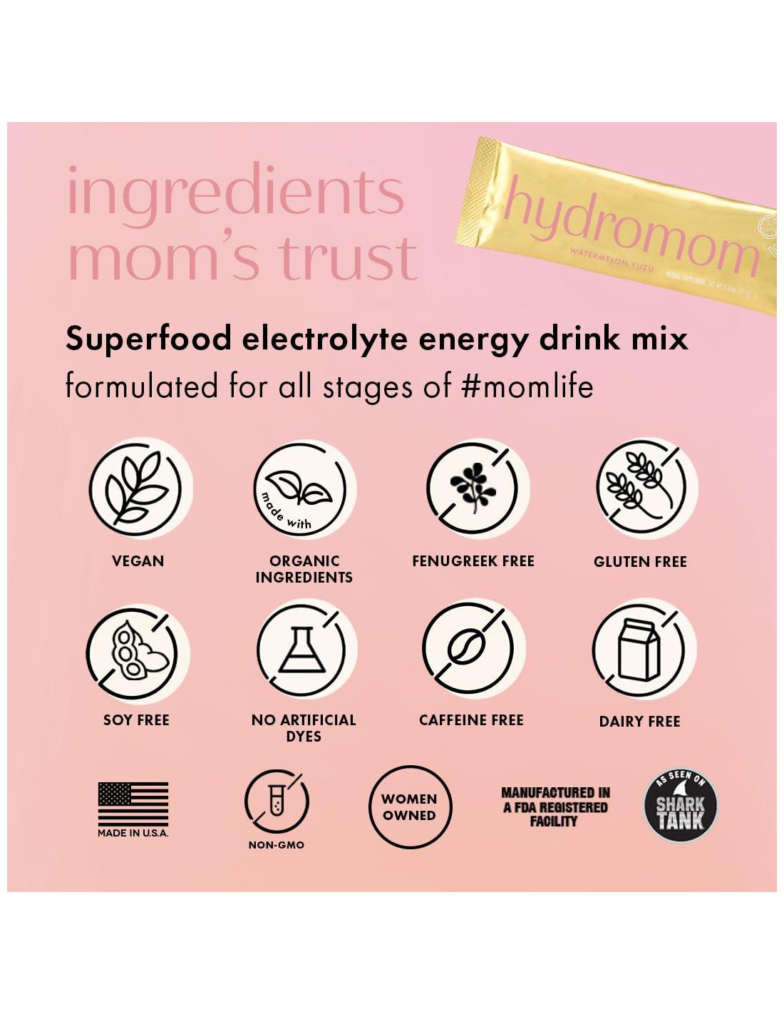 - Di Hola a la Hidratación: ¡Hidrátate y mantente energizada con el refrescante sabor de nuestra mezcla de bebida Hydromom Sandía Yuzu! Lleno de electrolitos esenciales, sodio y glucosa, esta mezcla de bebida es tu opción para convertir agua simple en un paraíso de hidratación. Viene con 10 paquetes de hidratación individuales.