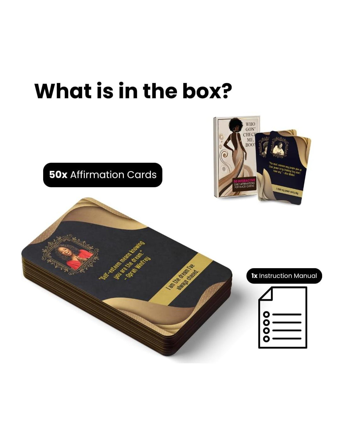 - Incluye audaces 'Afirmación Escucha, Perra' y 'Soy Todo Afirmación Tarjeta Baraja' - afirmaciones diarias que aumentan la confianza para mujeres negras con imágenes hermosas.