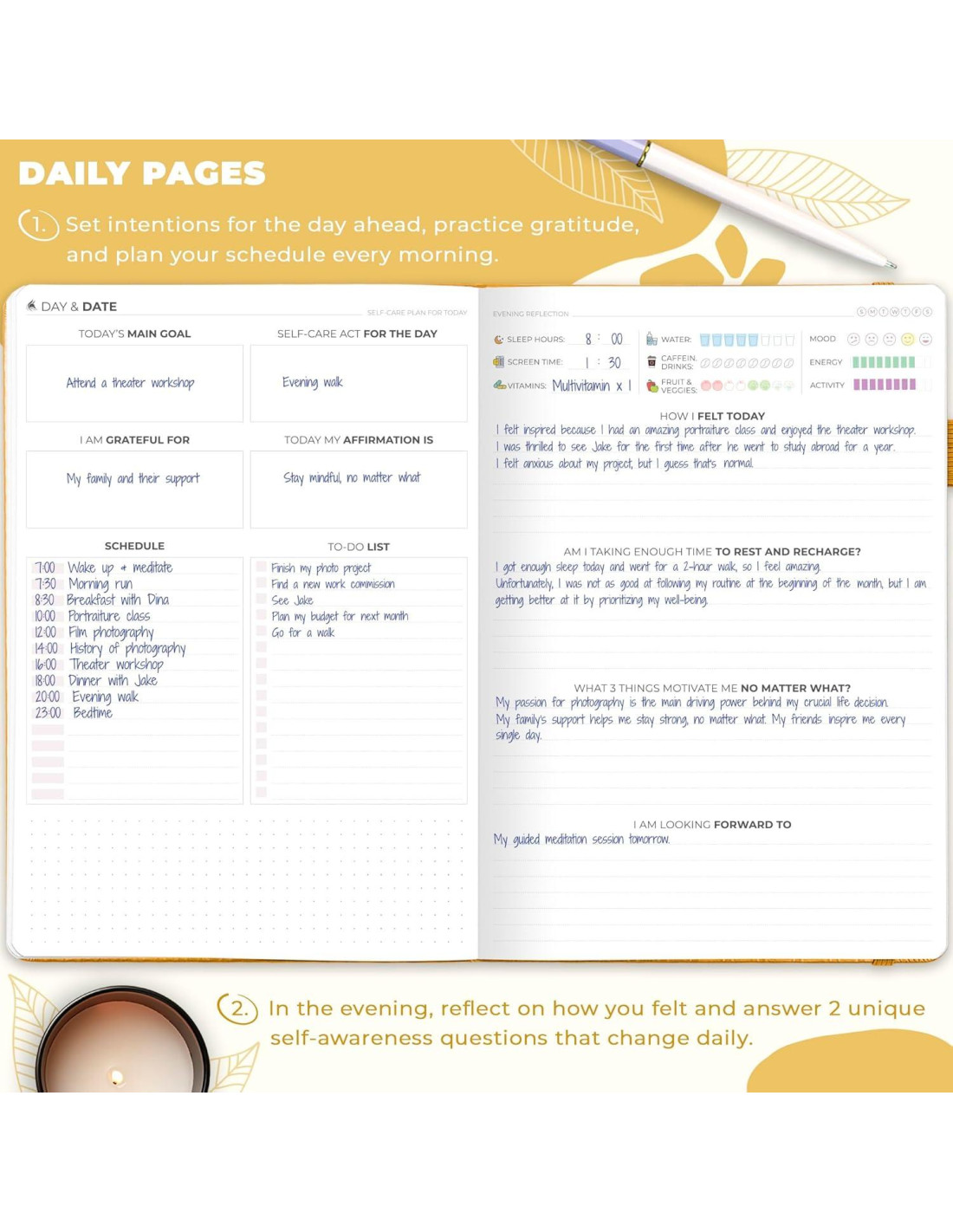 - APOYA UNA PERSPECTIVA POSITIVA DE LA VIDA CON EL DIARIO DIARIO: Cada mañana, practica la gratitud y elige tu afirmación para fomentar la positividad. Cada noche, reflexiona sobre tu día y construye autoconciencia respondiendo dos preguntas que cambian diariamente.