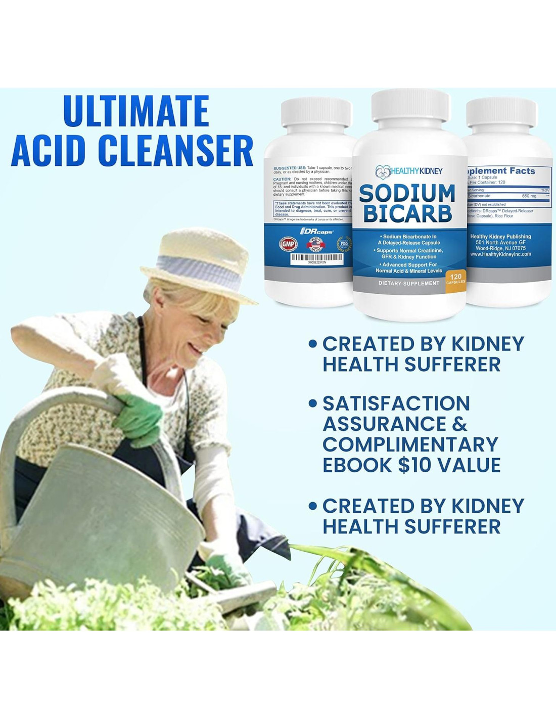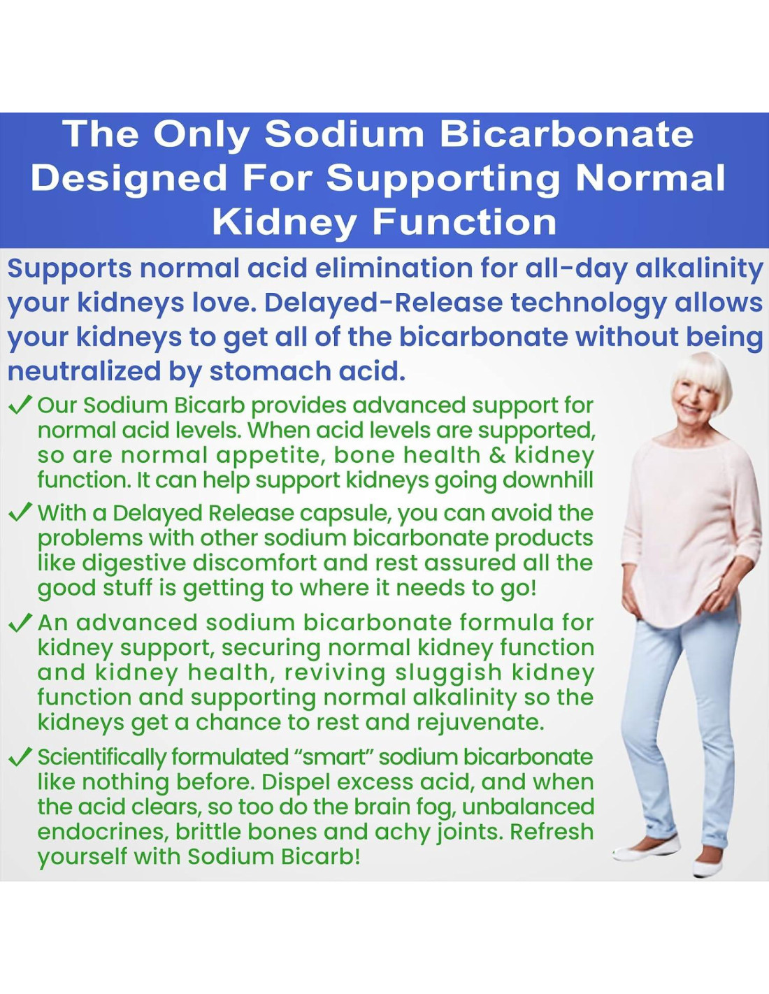 - El Bicarbonato de Sodio ha sido estudiado como un supremo alcalinizador de ácido para los riñones, pero solo funciona si llega a donde lo necesitas. Nuestro poderoso Bicarbonato de Sodio lanza una carga de acción neutralizadora de ácido justo donde lo necesitas, con la cápsula de liberación retardada actuando como una barrera mientras navega su camino más allá de los ácidos del estómago y limpia la acumulación de ácido de los riñones, llevando a apoyar la restauración renal y la función renal normal. Alivia el estrés renal hoy. Ebook/Guía de Usuario complementaria te muestra cómo usar efectivamente este suplemento y alcalinizar tu cuerpo, junto con otros útiles bonos e información para ayudar a tus riñones.