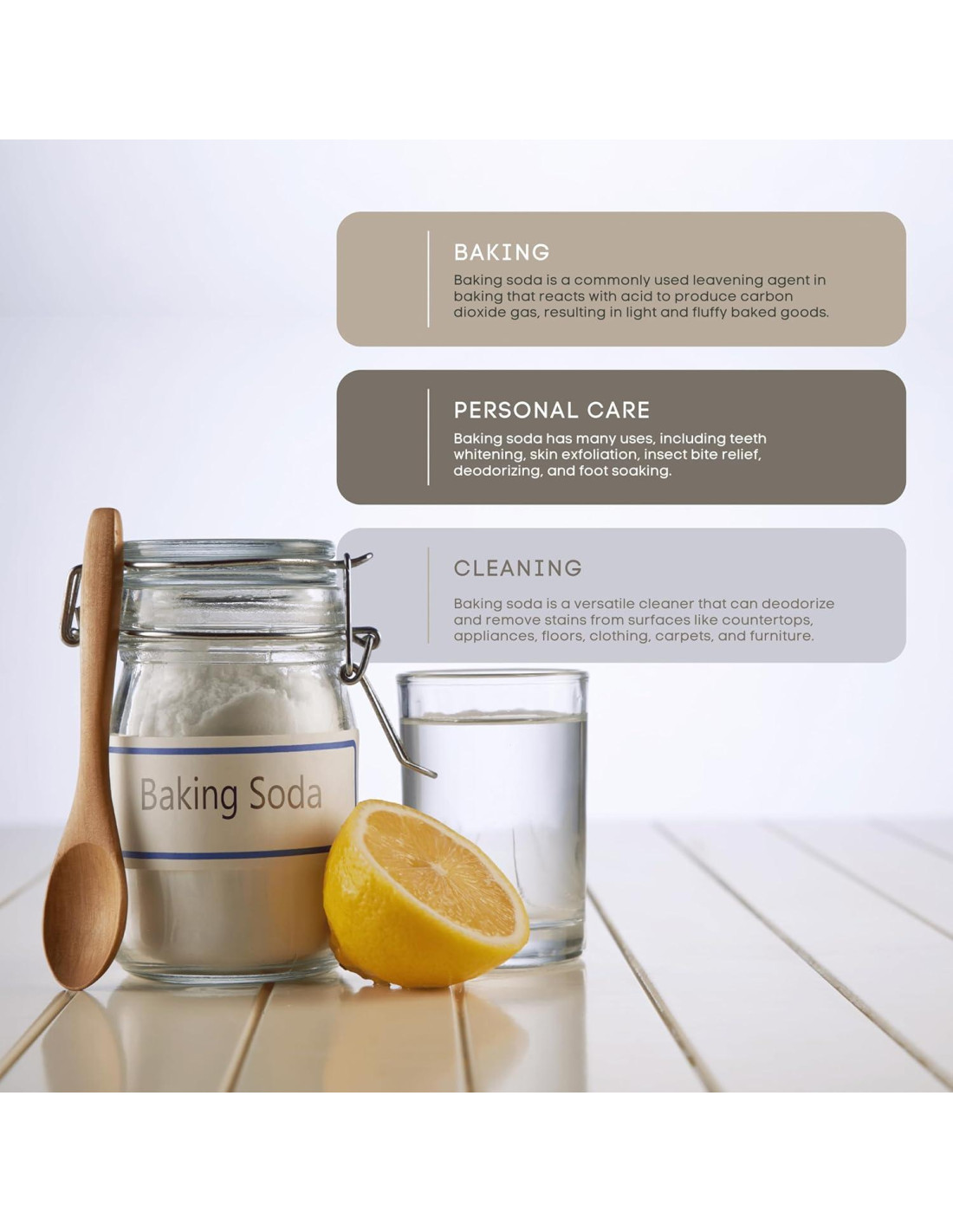 - Cuidado personal: El bicarbonato de sodio se puede usar para cepillarse los dientes, blanquear los dientes, exfoliar la piel y calmar picaduras de insectos. También se puede usar como desodorante y como remojo para pies.