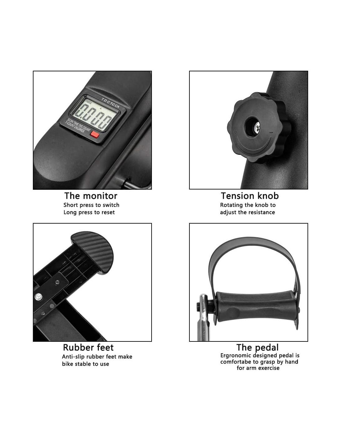 - FÁCIL DE USAR - Simplemente coloca la máquina en el suelo o incluso debajo de tu escritorio y pedalea para trabajar los músculos de las piernas y quemar calorías. La bicicleta de pedales también se puede colocar sobre una mesa para estimular la circulación y tonificar los músculos de los brazos.