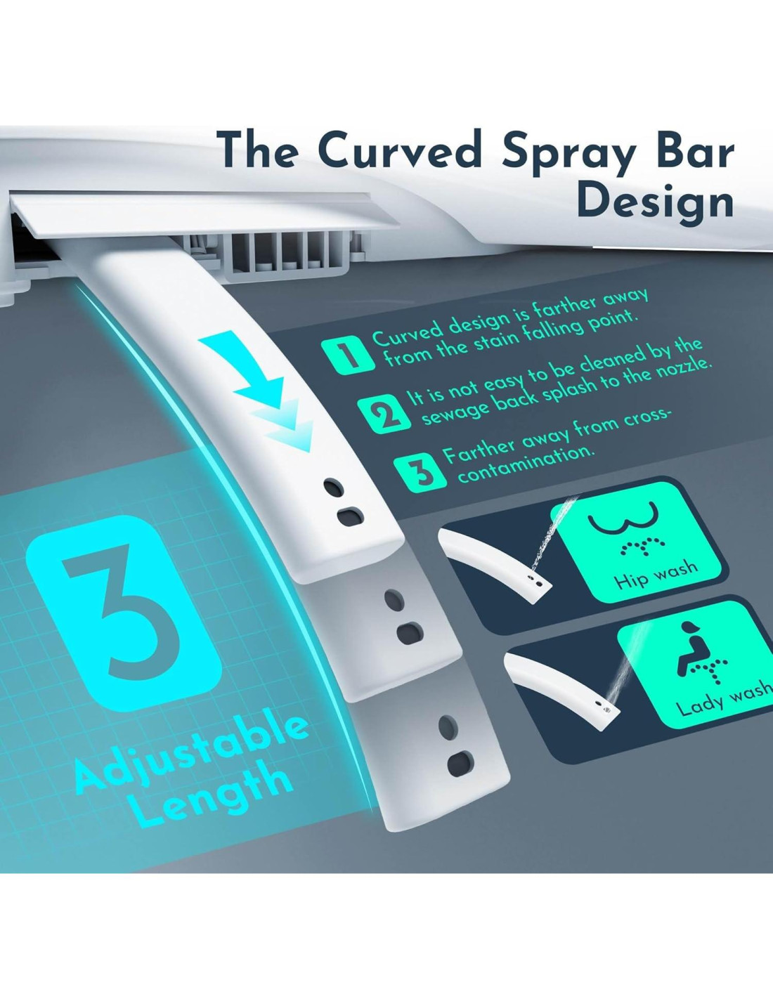 - Diseño de barra de pulverización curvada: En comparación con la barra de pulverización recta ordinaria, el bidet eléctrico de barra de pulverización curvada está más alejado del punto de caída de manchas, no es fácil que salpique agua residual después de la limpieza.