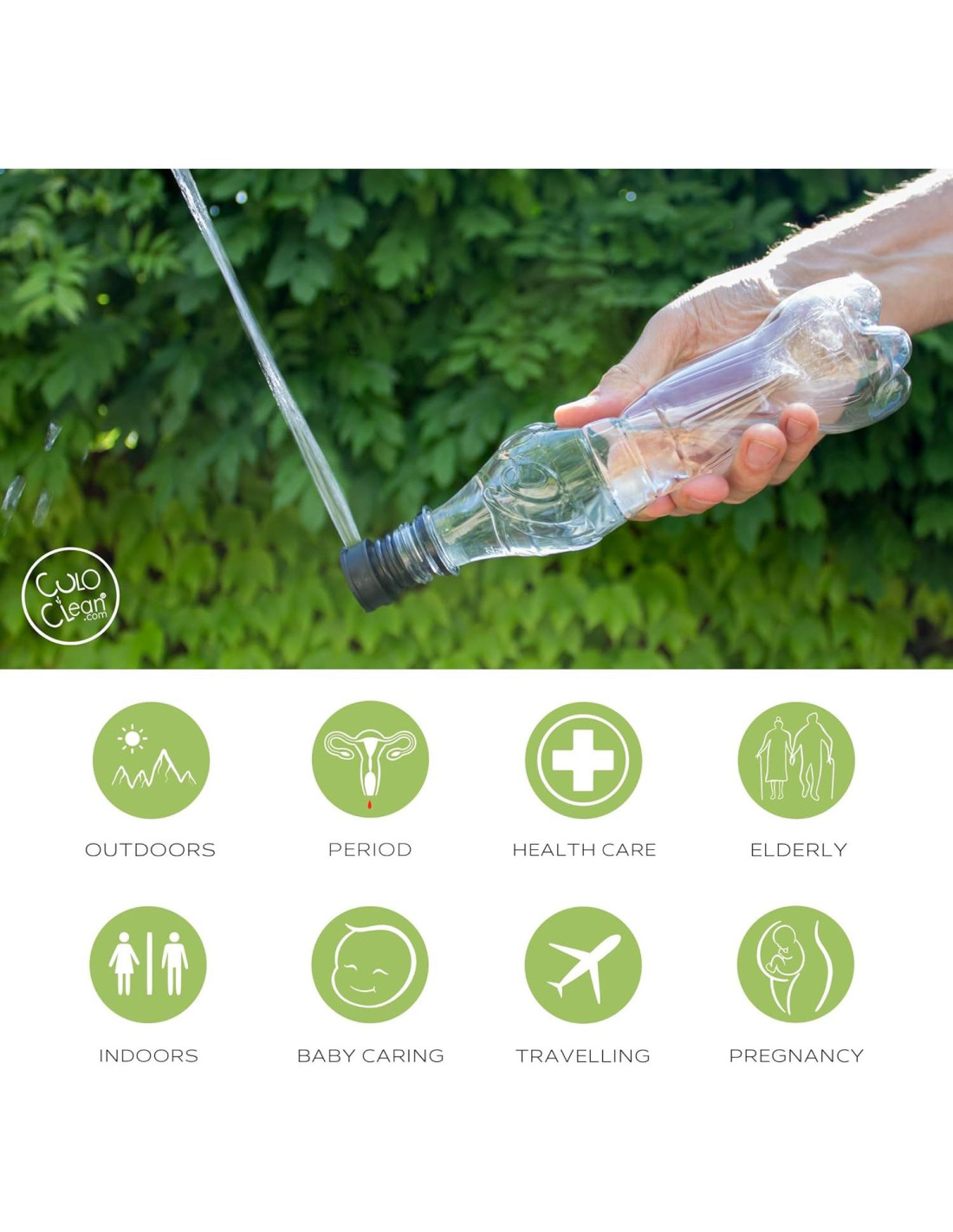 - EL BIDET DE VIAJE MÁS LIGERO DEL MERCADO. CuloClean es el bidet portátil más pequeño, ligero y discreto del mercado. Un bidet de mano compatible con cualquier botella de plástico. ¡Solo 0.012 kg! Perfecto para senderistas.
