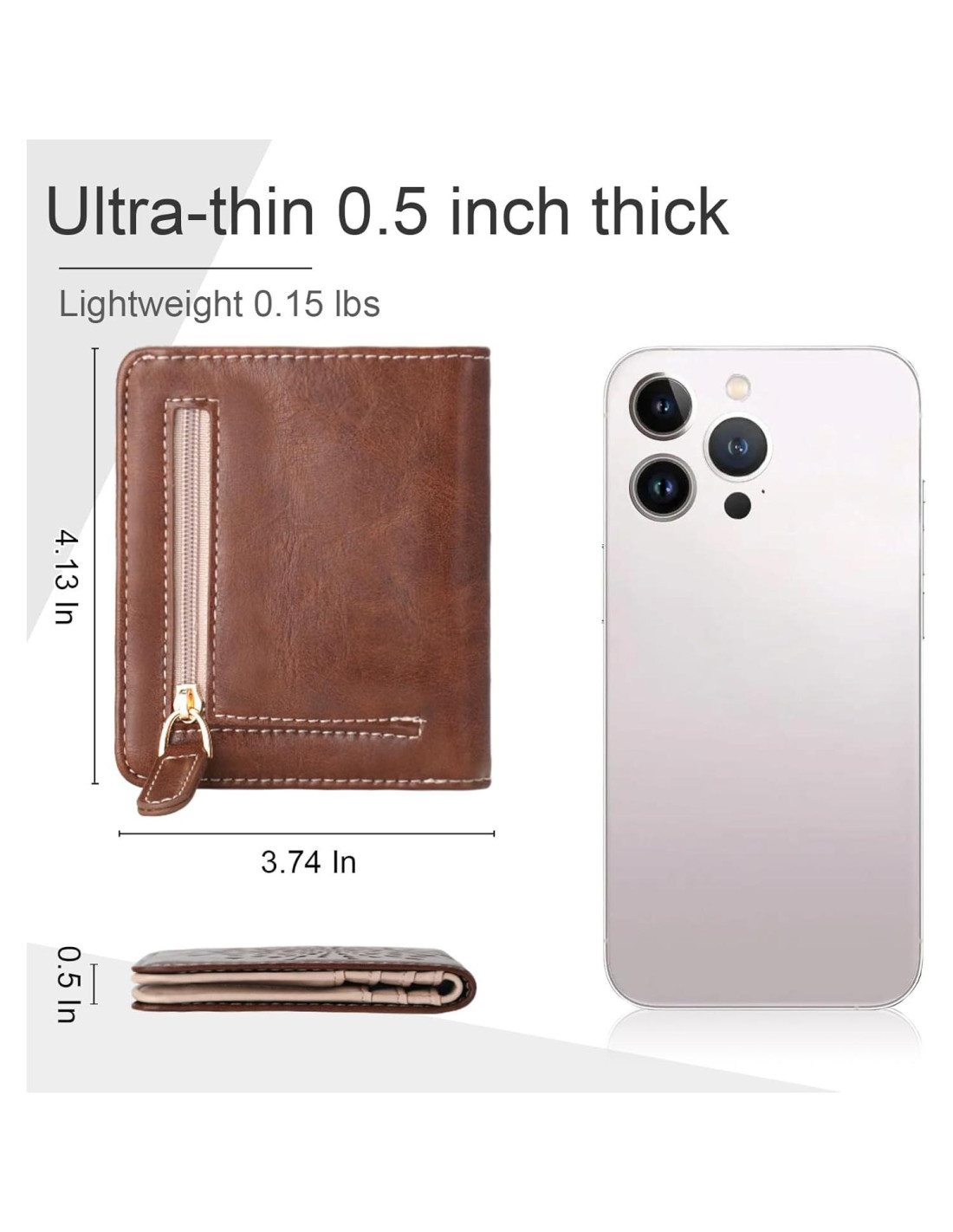- Cartera Slim para Mujeres 3.7 x 0.5 x 4.13 pulgadas (9.40 x 1.27 x 10.49 cm), cartera pequeña y delgada, solo 0.5 pulgadas (1.27 cm) de grosor y 70g (0.15 lbs) de peso ligero. Se ajusta perfectamente a tu bolsillo o bolso. Con 6 ranuras para tarjetas, 1 ranura para efectivo, 1 ranura para identificación, 1 bolsillo con cremallera. Esta cartera para mujeres puede satisfacer todas tus necesidades.