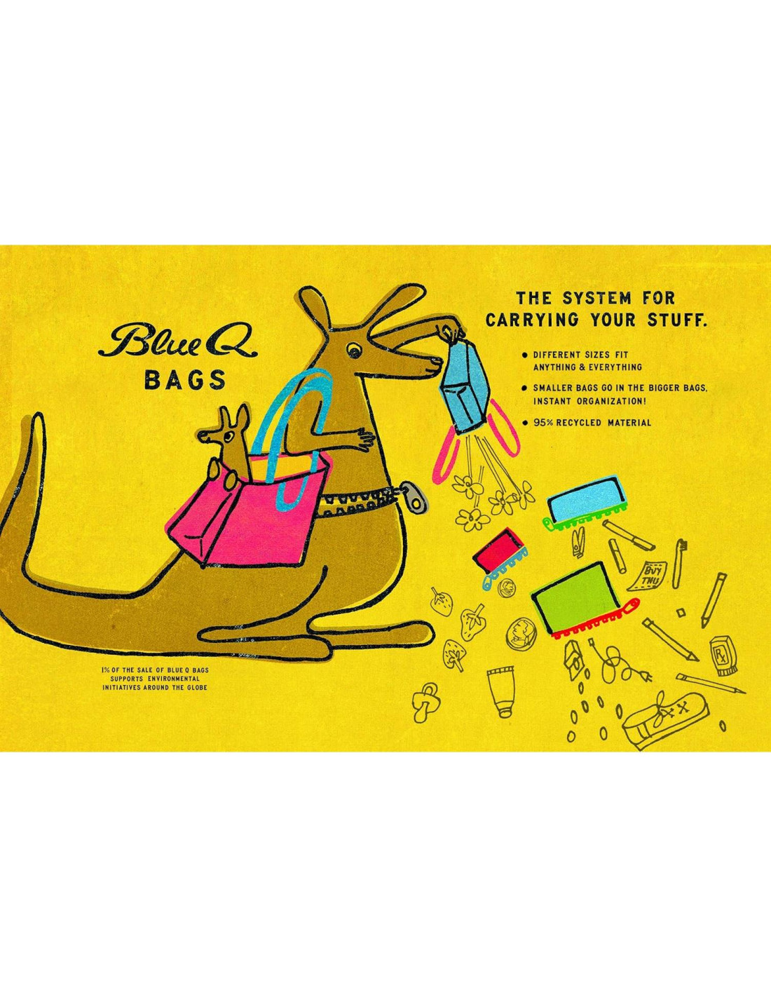 - EL SISTEMA PARA LLEVAR TUS COSAS: Las bolsas Blue Q organizan, agrupan, viajan y transportan. Tenemos más de 150 diseños en 7 formas/tamaños de bolsas diferentes. Probablemente tengamos una que te encantará.