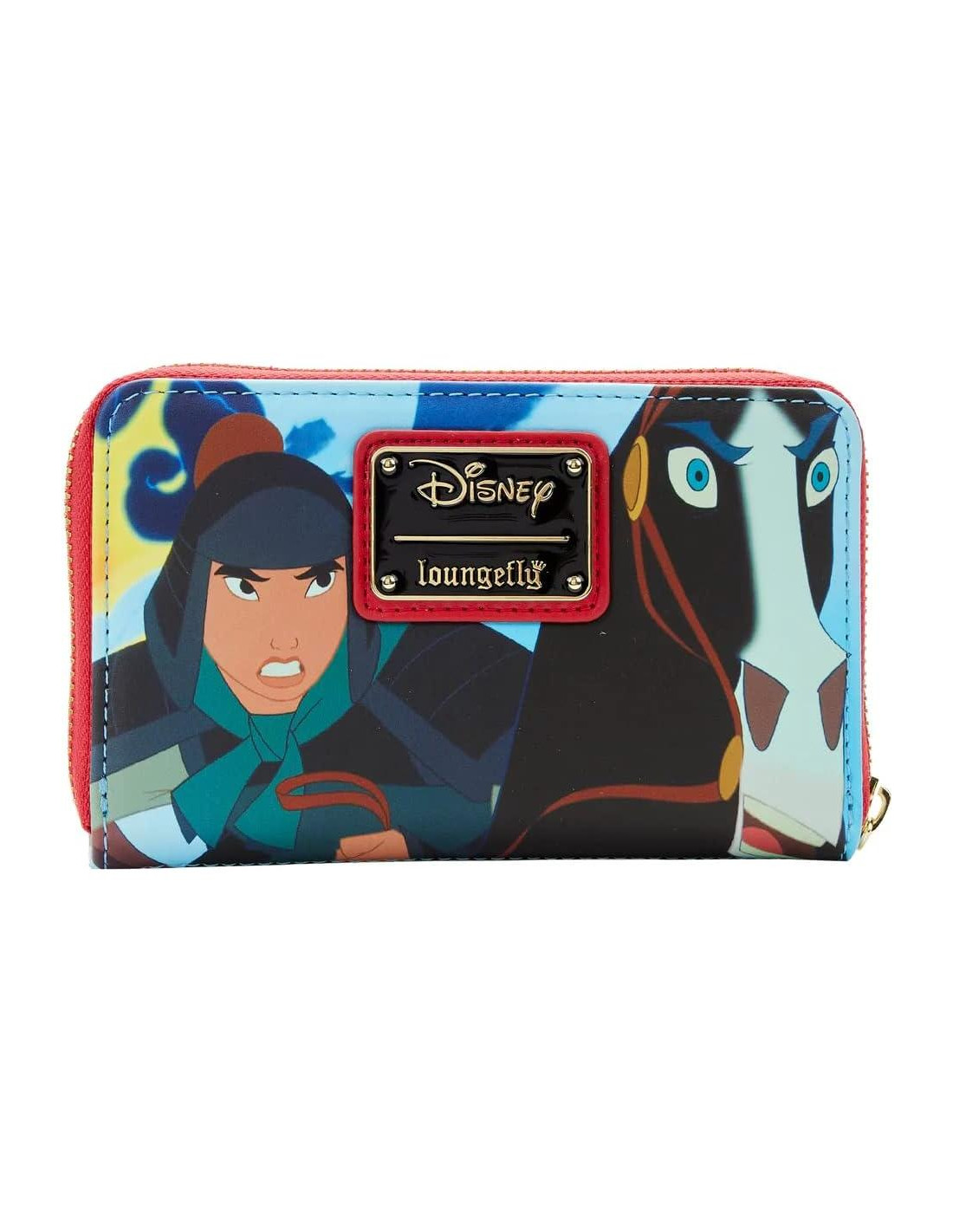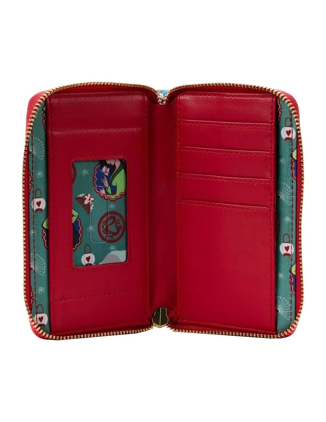 - La billetera con cierre alrededor de la escena de la princesa Mulan de Loungefly Disney está hecha de cuero vegano (poliuretano). La billetera se cierra con cremallera, tiene herrajes metálicos de color dorado brillante y presenta detalles impresos. Toma nota del patrón coordinado de la tela del forro interior.