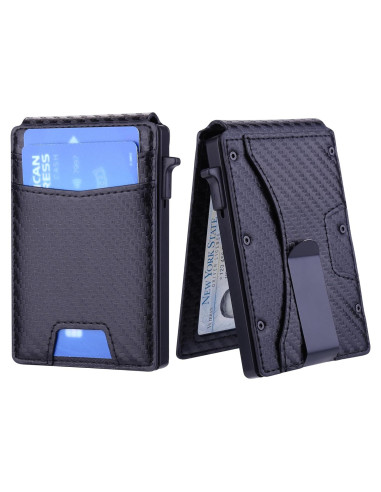 - ACCESO RÁPIDO: A diferencia de la billetera de cuero tradicional, esta billetera slim para hombres está equipada con un mecanismo de expulsión. Simplemente presiona el botón lateral en el soporte de tarjetas, todas las tarjetas se elevan en un patrón escalonado que las hace muy fáciles y convenientes de sacar.