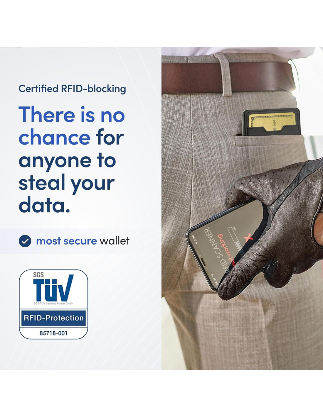 - La función de bloqueo RFID de nuestra cartera de bolsillo frontal ha sido certificada por el instituto independiente TÜV Alemania por bloquear completamente la frecuencia RFID 13.56 MHz. Esto protege tus tarjetas en el marco de aluminio y también el bolsillo frontal de ser leído.