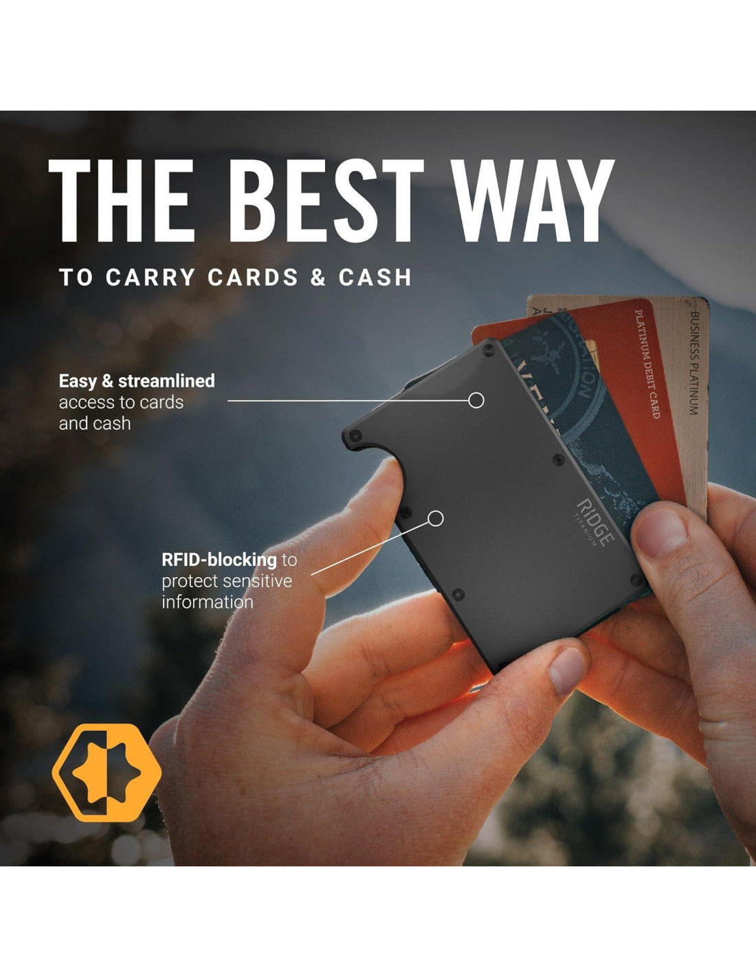 Placas anodizadas negras - 56.7 g | 86 x 54 x 6 mm marco - Elástico y tornillos intercambiables. El cuerpo de metal de esta billetera las protege incluso de los lectores de chips RFID más potentes. Elegimos nuestros materiales de grado militar para crear una billetera que durará toda la vida. Esto incluye los reemplazos de elástico, tornillos, clip de dinero y placa de correa para efectivo. El clip de dinero te permite asegurar varios billetes en el exterior de tu billetera en una forma tradicional de clip de dinero. El clip de metal patentado está diseñado para mayor seguridad y fiabilidad. La correa para efectivo te permite asegurar varios billetes en el exterior de tu billetera con un diseño de elástico con placa patentada. La placa de metal está diseñada para mayor seguridad y estética. Acepta de 1 a 12 tarjetas sin estirarse. La billetera delgada es ideal para llevar tarjetas de presentación, tarjetas de crédito y débito, billetes, etc. La muesca exterior te permite sacar las tarjetas fácilmente. Si alguna vez sientes que tu billetera no está funcionando correctamente, puedes hacer una reclamación y haremos nuestro mejor esfuerzo para solucionarlo. Esto incluye los reemplazos de elástico, tornillos, clip de dinero y placa de correa para efectivo. Cada compra de The Ridge es solo el comienzo de muchos años llevando una mejor billetera. Respira tranquilo porque tus tarjetas estarán rodeadas por el cuerpo de metal de esta billetera protegiéndolas incluso de los lectores de chips RFID más potentes. Materiales bloqueadores de RFID - aluminio 6061-T6 | placas de fibra de carbono anodizadas - 56.7 g | 86 x 54 x 6 mm marco - Elástico y tornillos intercambiables.