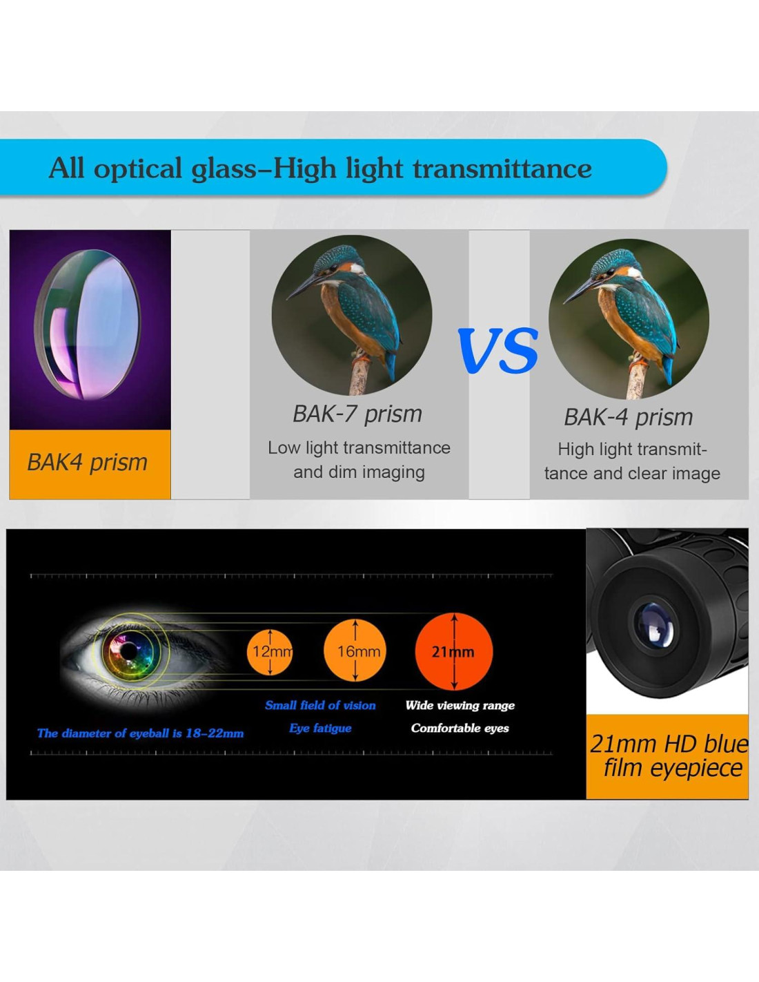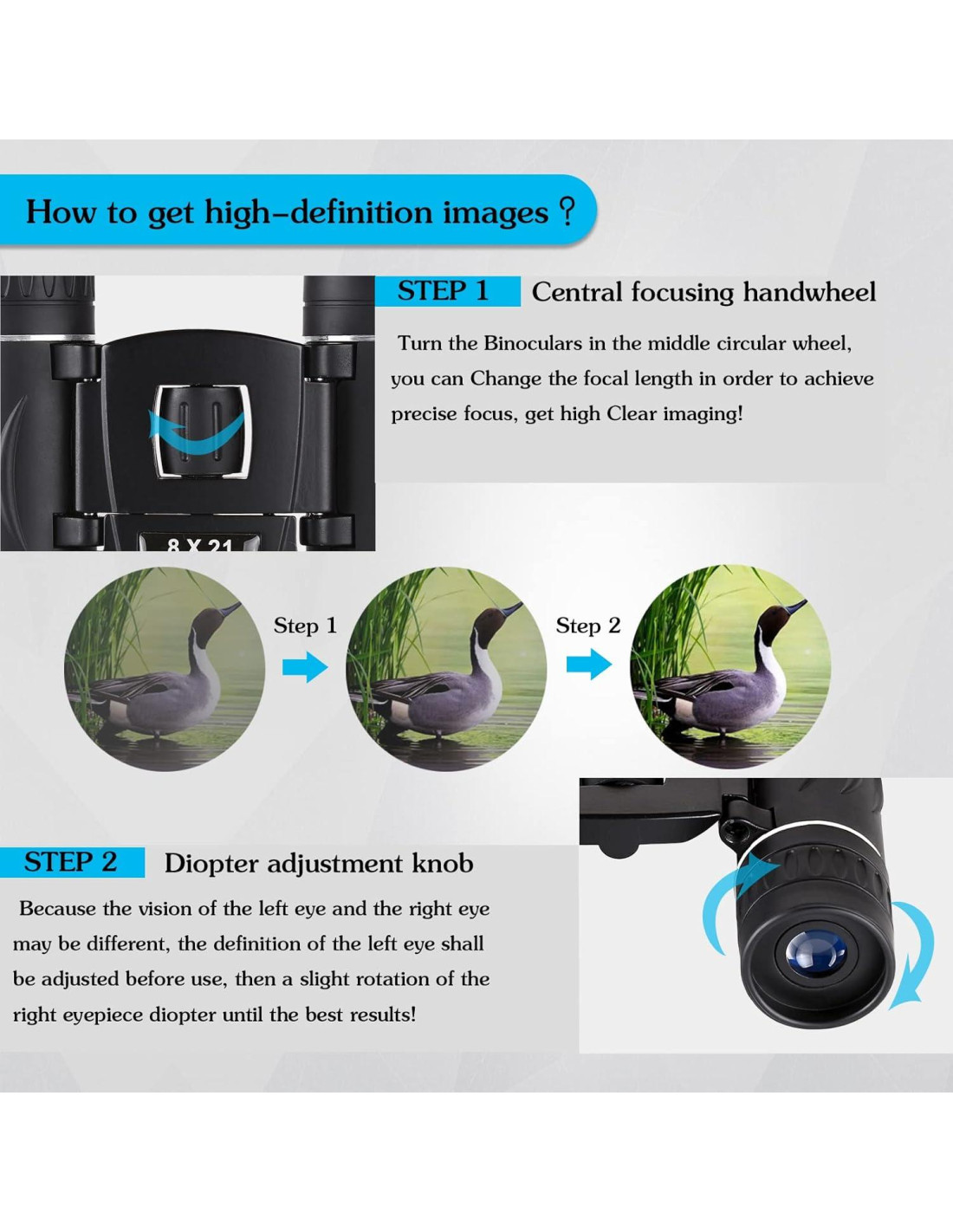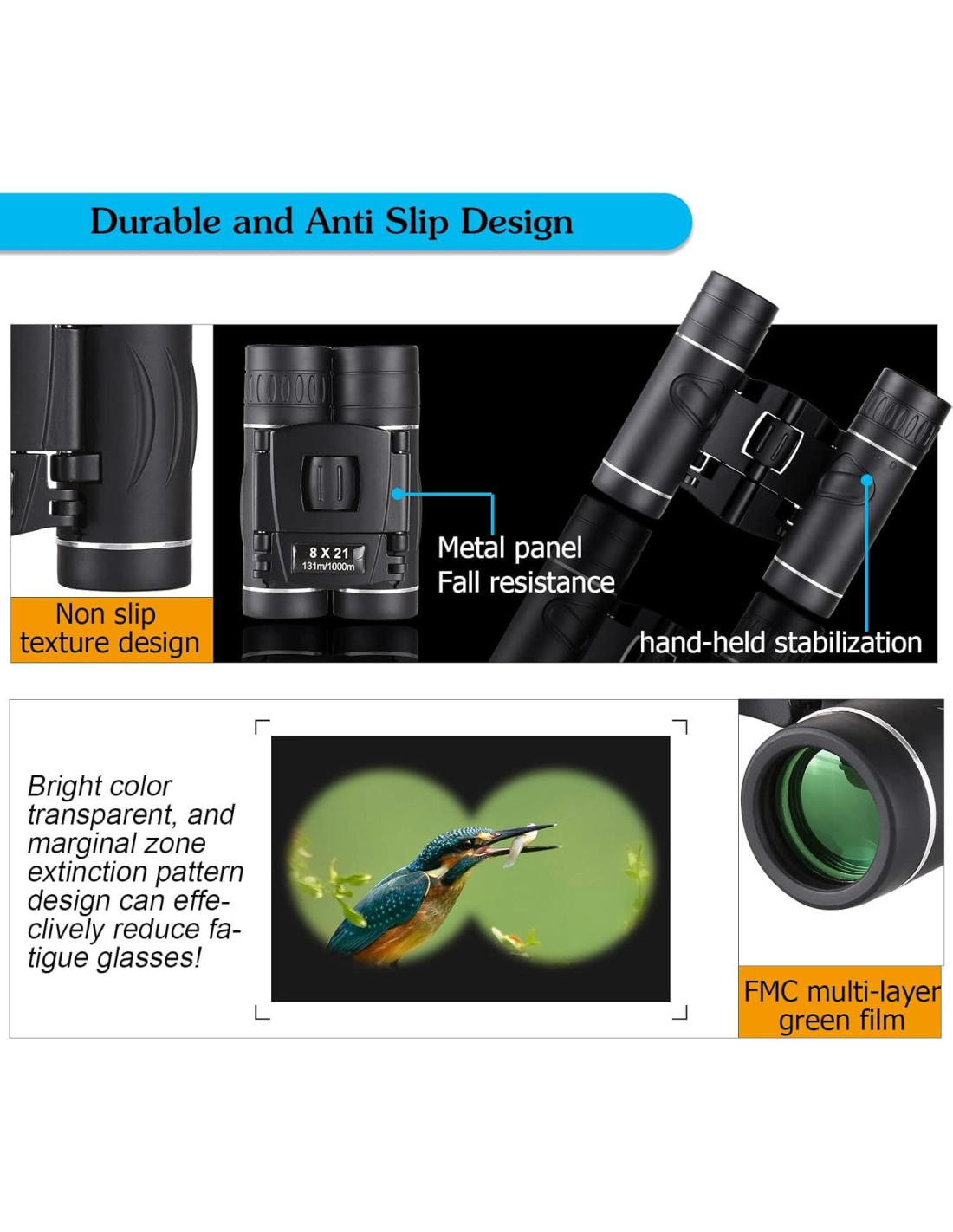 - [Visión Amplia y Clara] Binoculares ópticos 8x21, diseñados con 8X de aumento, lente objetivo de 21mm y un gran campo de visión de 369ft/1000yds (112m/1000m). Lentes hechas con prisma BAK4 que aumentan la transmisión de luz para una vista más brillante e imágenes nítidas.