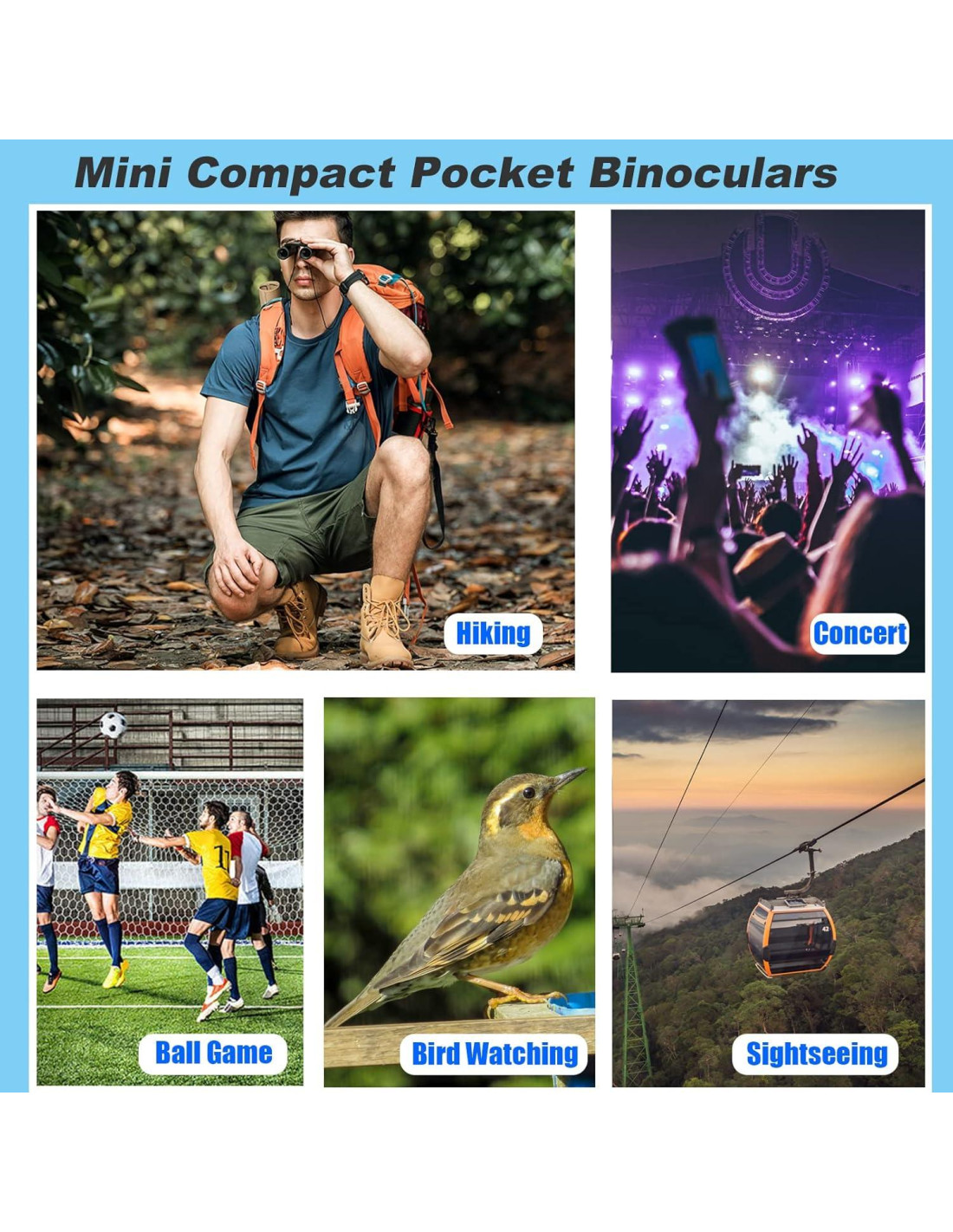 - [Diseño Duradero y Antideslizante] Los binoculares están hechos de goma de alta calidad, el agarre antideslizante duradero es más conveniente de usar en mal tiempo, los binoculares de tamaño de bolsillo son adecuados no solo para hombres y mujeres, sino también para niños. Es un regalo maravilloso para familiares y amigos.