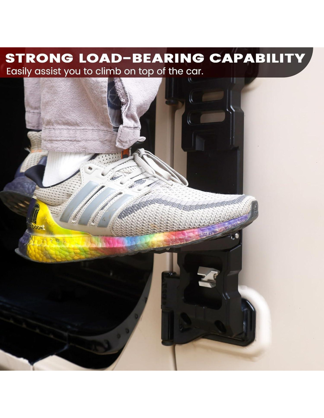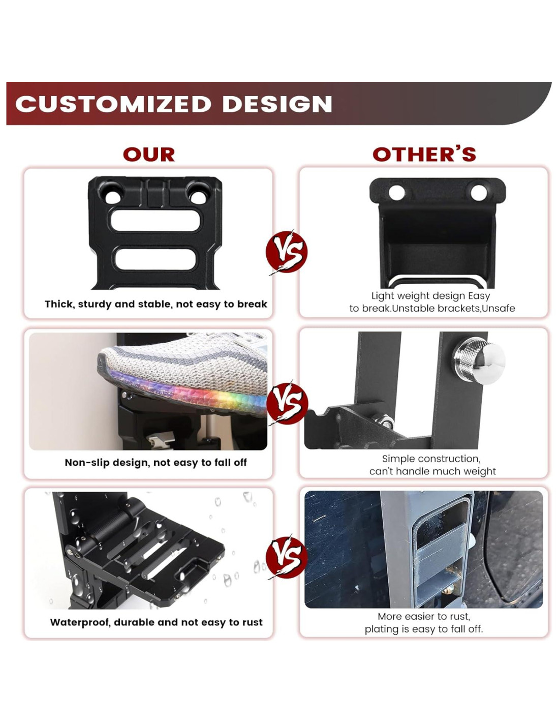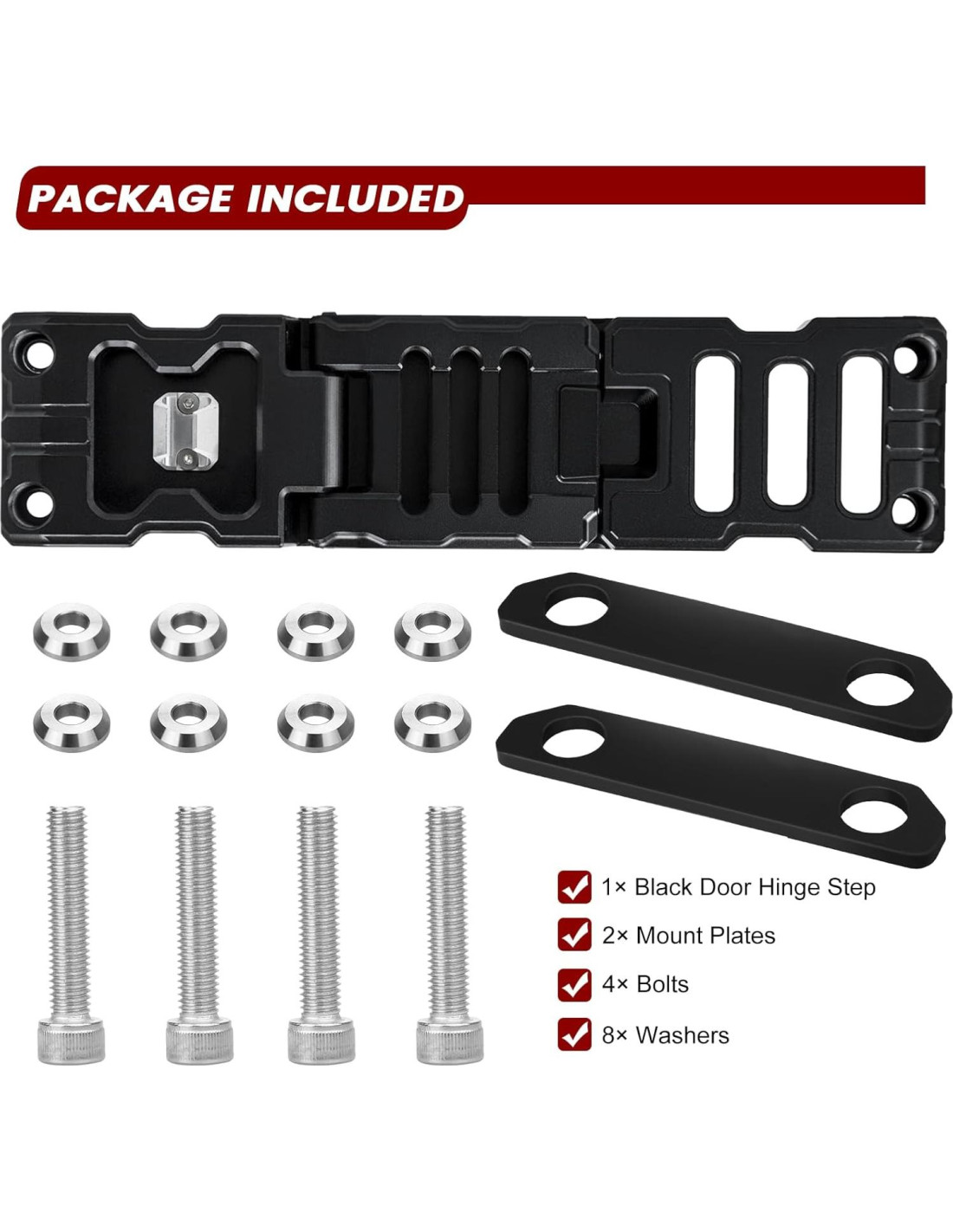 - [DISEÑO DE PEDAL PLEGABLE] Nuestro escalón de bisagra de puerta de gladiador jeep con diseño plegable, no afecta la apertura de la puerta, solo pliega cuando no necesitas usarlo; Hace que tu Jeep se vea increíble.
