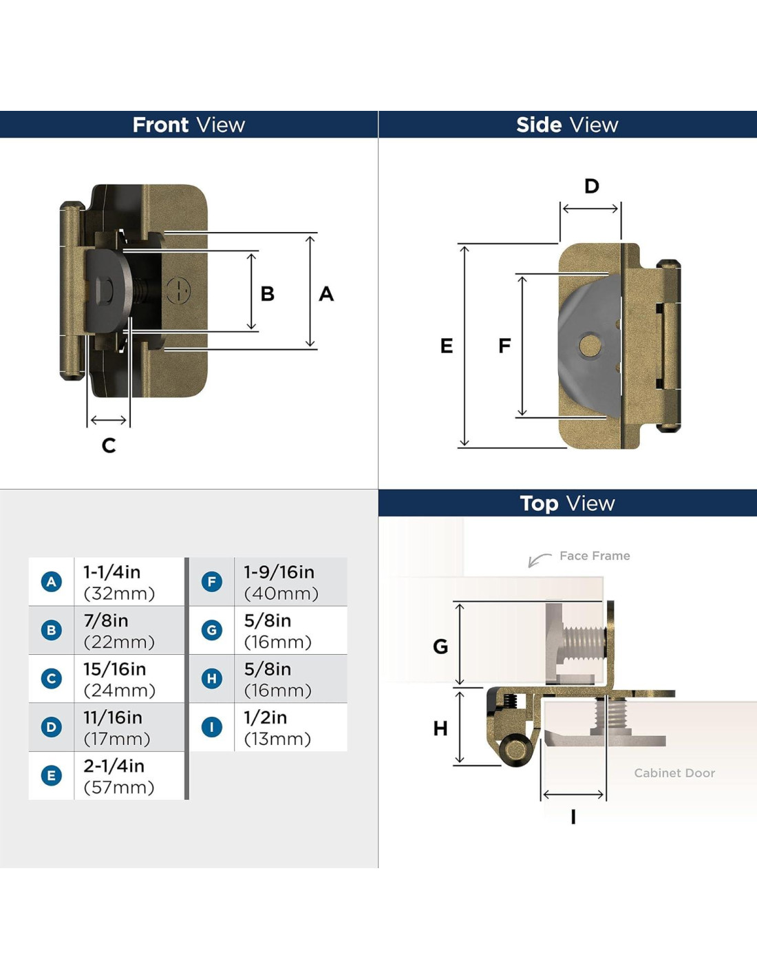 - ALTA CALIDAD - Par de bisagras dobles desmontables diseñadas para armarios de marco frontal con una superposición de 1/2 pulgada (13 mm). "Superposición" se refiere a cuánto cubre la puerta del armario, o se superpone, al marco del armario cuando está cerrado. Por favor, mida cuidadosamente antes de ordenar.
