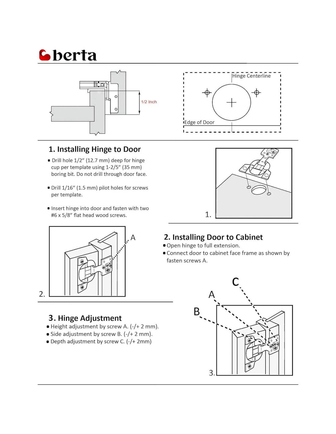 - ESPECIFICACIONES PRINCIPALES: Superposición: 1/2 pulgada, Ángulo de Apertura: 90 Grados, Tipo de Cierre: Cierre Suave, Ajuste: Ajuste Vertical 3-Cam, Horizontal y Profundidad. Estas son las principales especificaciones de nuestras bisagras, por favor mira la sección de descripciones al final para una vista completa de todas las especificaciones.