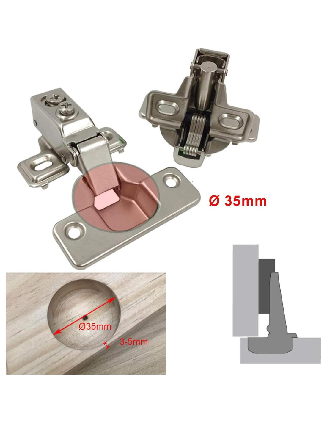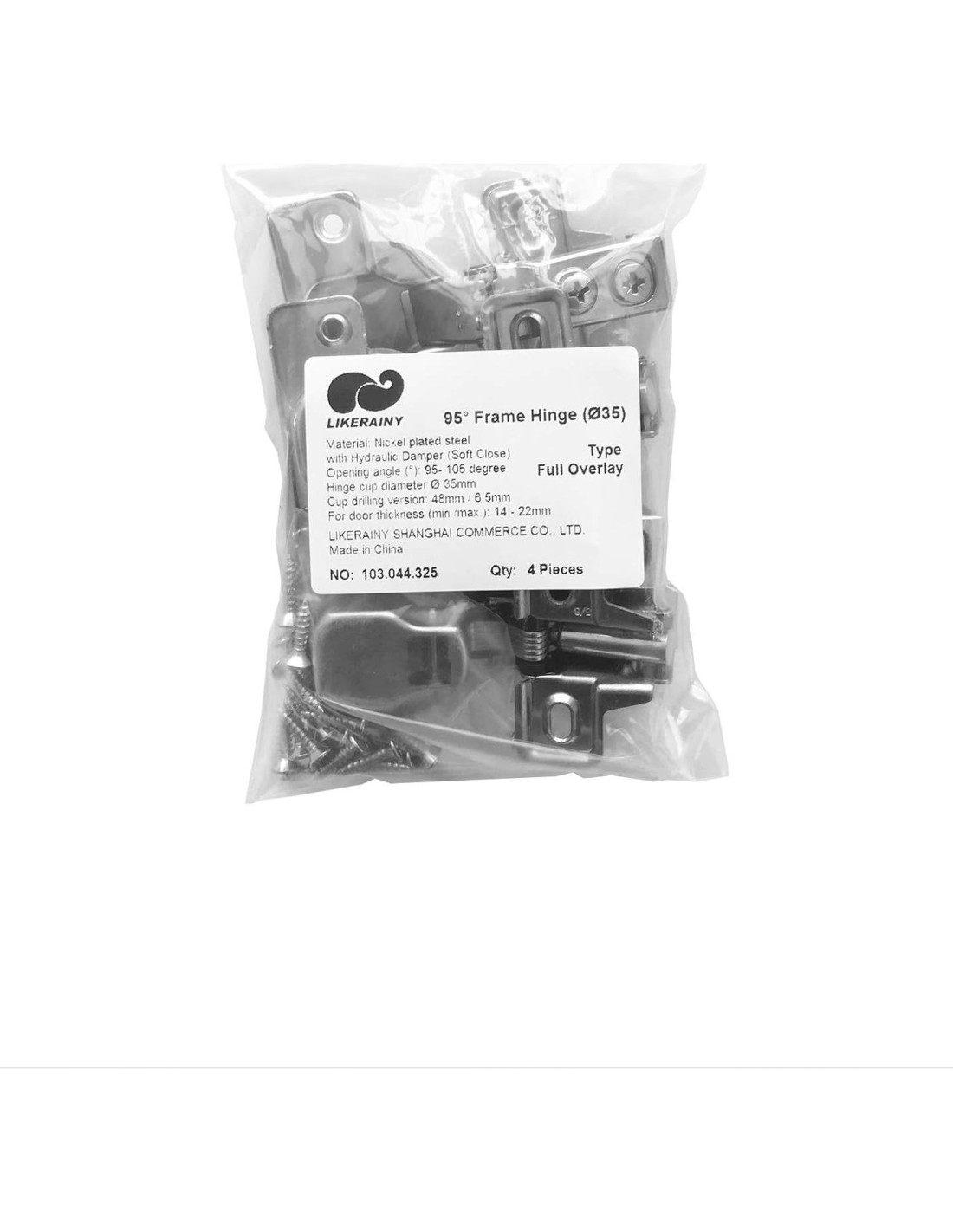 Por favor, determine el tipo de aplicación de su bisagra (Superposición Completa, Superposición Media y Empotrada) antes de comprar Dimensiones del Producto -Tipo de artículo: bisagra de marco de cara LIKERAINY con amortiguador de cierre suave -Material: Acero inoxidable -Ángulo de apertura (): 95-105 Grados -Versión de perforación de copa: 48mm / 6.5mm -Diámetro de la copa: 35mm -Profundidad de la copa: 13mm -DISTANCIA entre los dos agujeros de tornillo (junto a la copa): 48mm -Opción de montaje: para atornillar -Opción de montaje de puerta: Aplicación de Puerta de Superposición Completa -Para grosor de panel lateral: 14mm (mín.) - 20mm (máx.) -Para grosor de puerta: 14mm (mín.) - 22mm (máx.) -Para profundidad de gabinete (mín.): 35mm (la longitud del cuerpo de la bisagra en condición cerrada) (ver foto arriba) -Ajuste de superposición integrado: +2.5 mm / -2.5 mm -Ajuste de profundidad integrado: +2.0mm / -2.0 mm -Acabado de la copa/brazo de la bisagra: Chapado en cobre y chapado en níquel -Tapa de cubierta para el cuerpo: NO -Tapa de cubierta para la copa de la bisagra: NO -Instalación rápida: Sí Paquete - 35mm bisagras de marco: 4 Piezas -con tornillos de montaje - Sin instrucciones de montaje e información de procesamiento (ver fotos arriba)