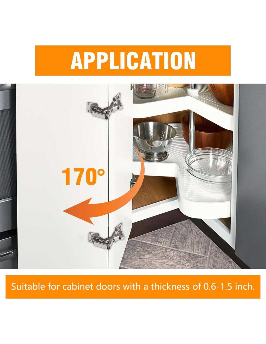 - Diseño de 170 Grados: Con un ángulo de apertura de 170 grados, nuestras bisagras permiten que las puertas de tu gabinete se abran ampliamente, ofreciendo fácil acceso al contenido en su interior. Son perfectas para puertas de gabinete con un grosor que varía de 1.5 a 3.8 centímetros, proporcionando versatilidad para varios arreglos de cocina y hogar.