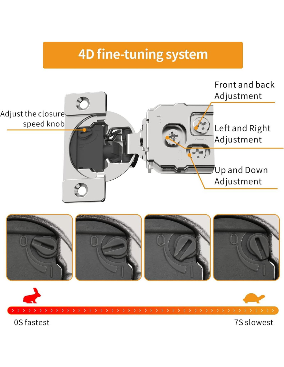 - Actualización ajustable 4D: Las bisagras 4D pueden ajustar la puerta del armario simplemente girando un destornillador (Vertical, Horizontal, Profundidad, Velocidad de Cierre), lo que asegurará que sus nuevas puertas de armario personalizadas no se hundan, se alineen correctamente y se abran y cierren suavemente; La velocidad de cierre se puede ajustar a voluntad dentro de 0-7s.