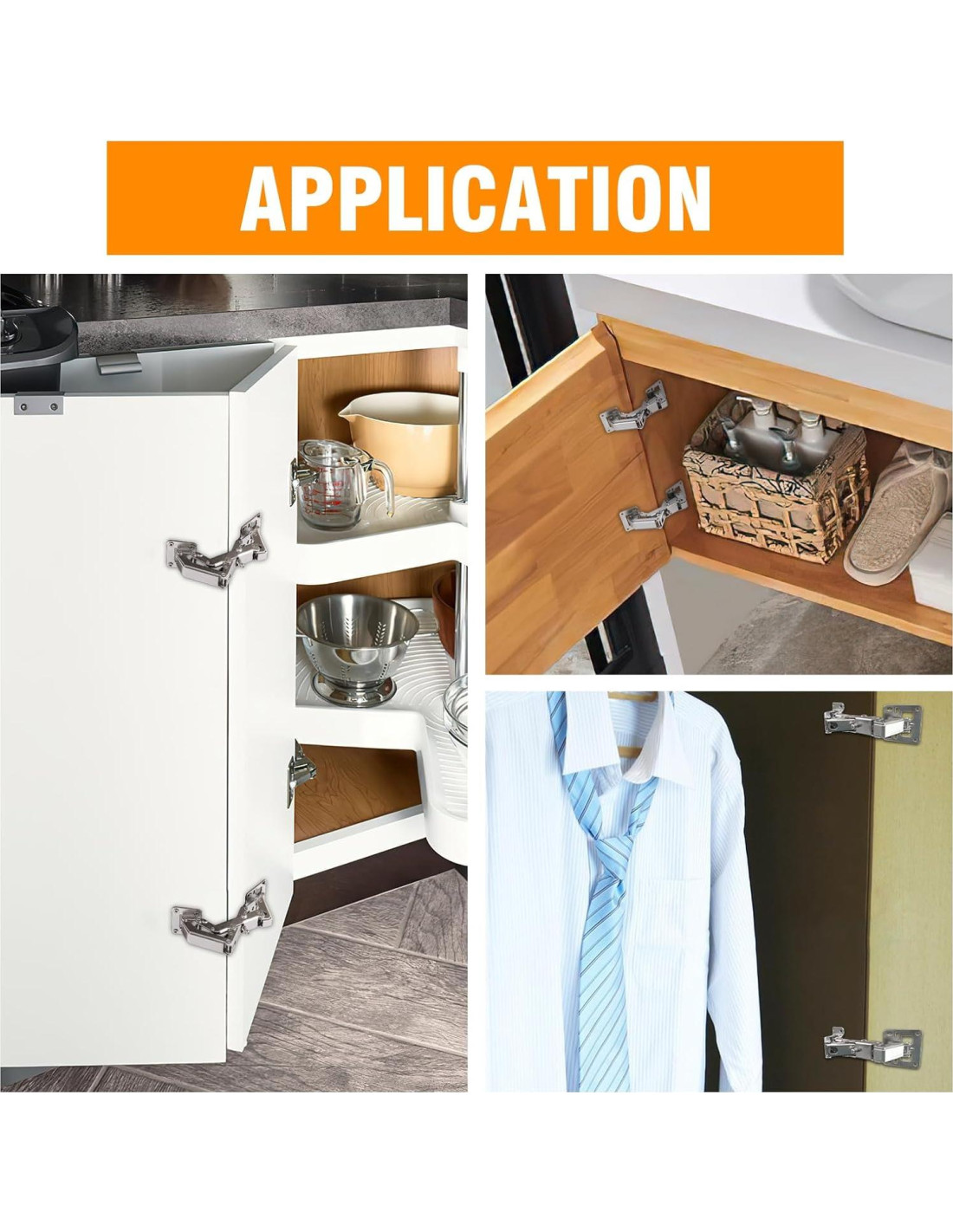 - Adecuadas para Varios Armarios Esquinados: Diseñadas con versatilidad en mente, estas bisagras son ideales para varios armarios esquinados. Proporcionan la solución perfecta para áreas incómodas o de difícil acceso, asegurando que tus armarios sean funcionales y accesibles.