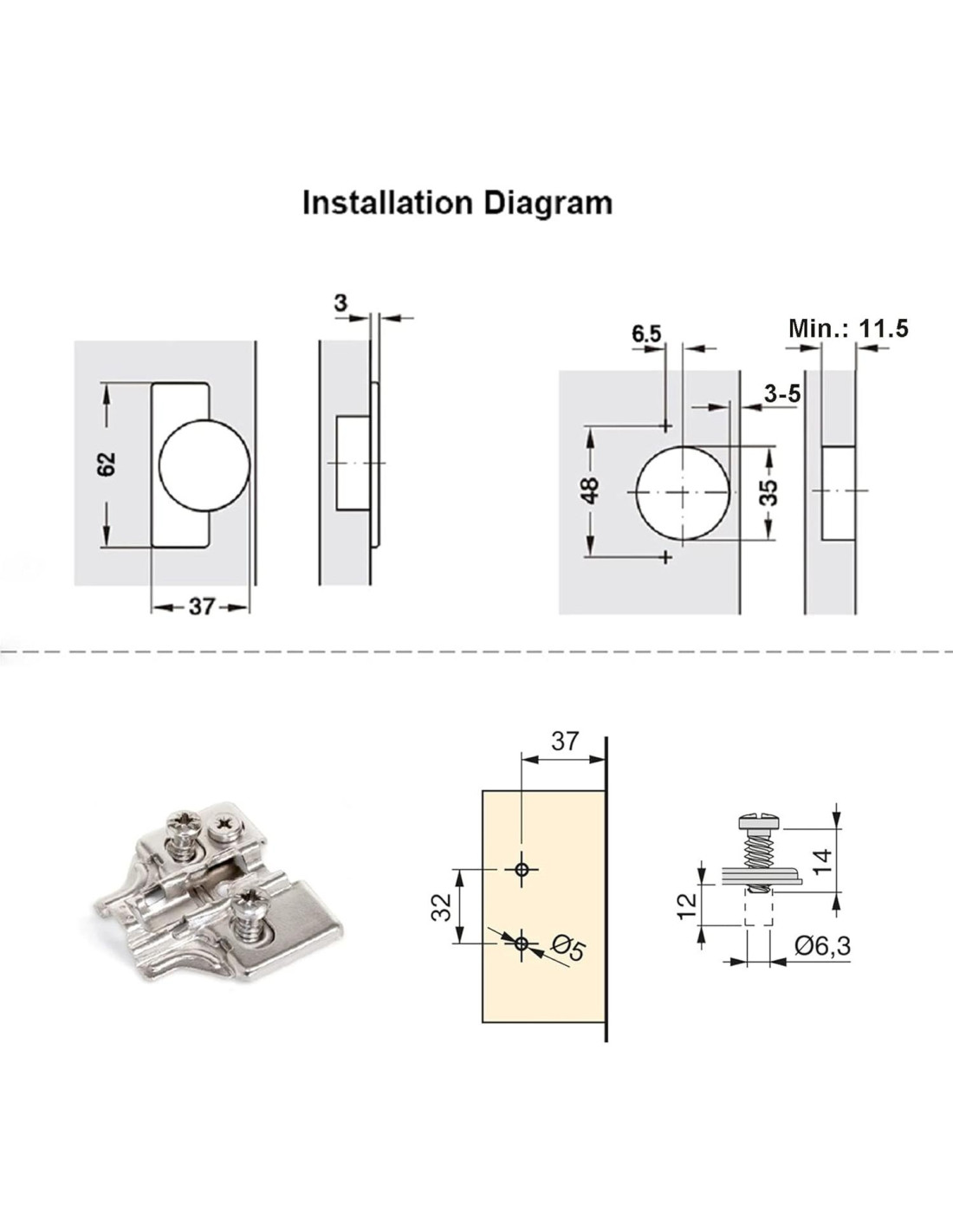 - Para grosor de puerta de 16-19mm; Diámetro del vaso 35mm (tamaño estándar); Profundidad del vaso 11.5 mm