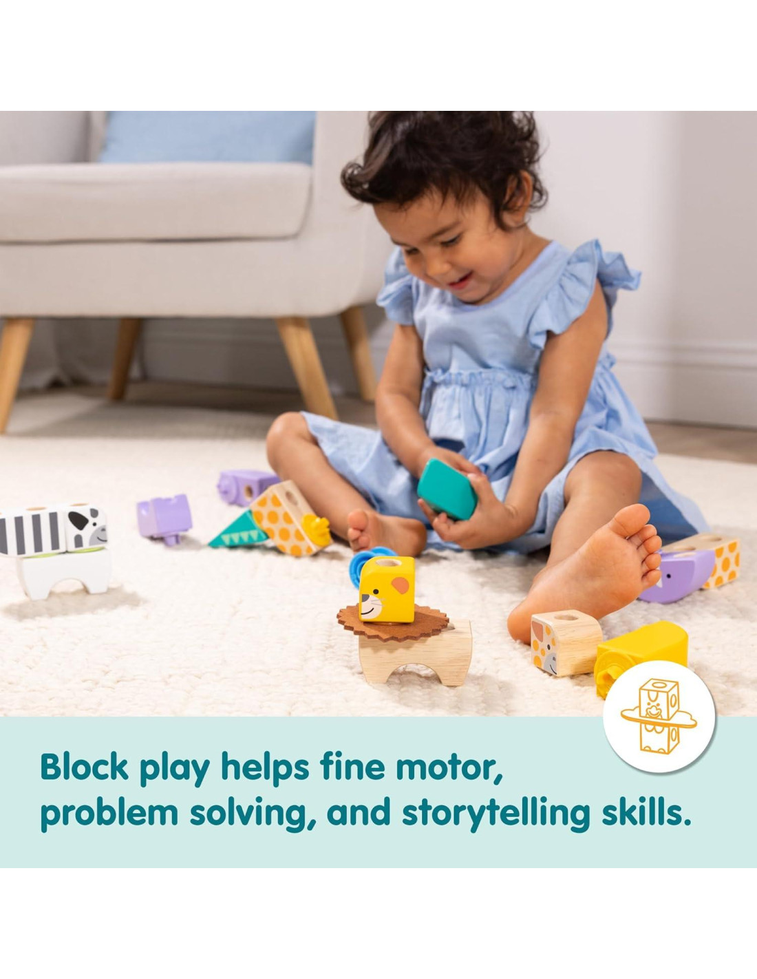 - Melissa & Doug Blockables son bloques de construcción de madera maciza conectables, apilables y jugables, perfectos para manos pequeñas y grandes imaginaciones; conectores especiales permiten a los niños de 2 años en adelante unir fácilmente bloques suaves y coloridos para crear divertidos animales de safari para jugar, o combinar para construir sus propios personajes tontos y creaciones geniales.