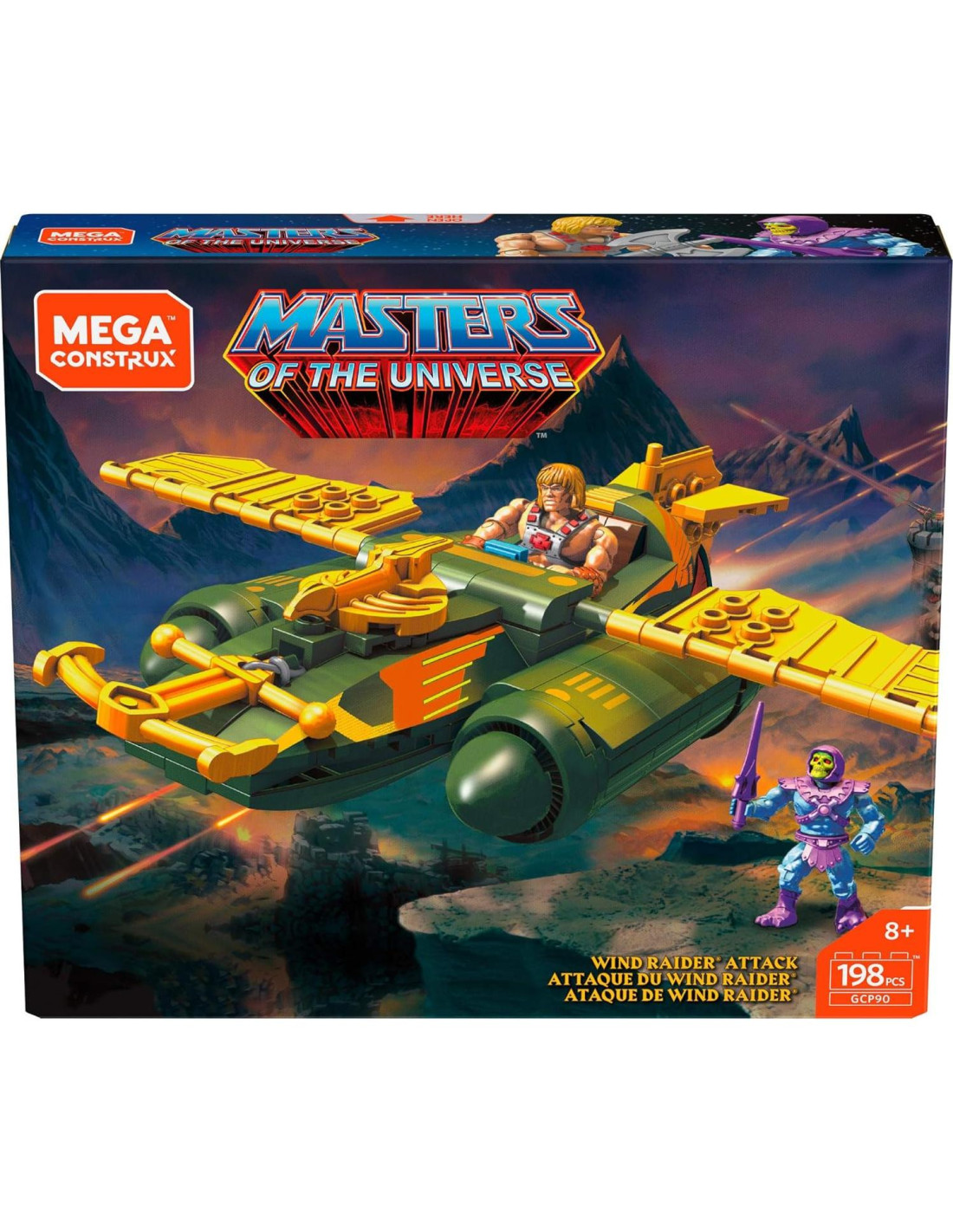 Construye el Wind Raider y sorprende a Skeletor con He-Man. ¡Skeletor no es rival para He-Man cuando construyes el Wind Raider y atacas por sorpresa! El icónico vehículo de Masters of the Universe cuenta con alas y cola articuladas y ruedas que ruedan para aterrizajes suaves. Ambas figuras de acción micro coleccionables presentan detalles de lujo y decoración impresa premium. Ideal para mayores de 10 años.