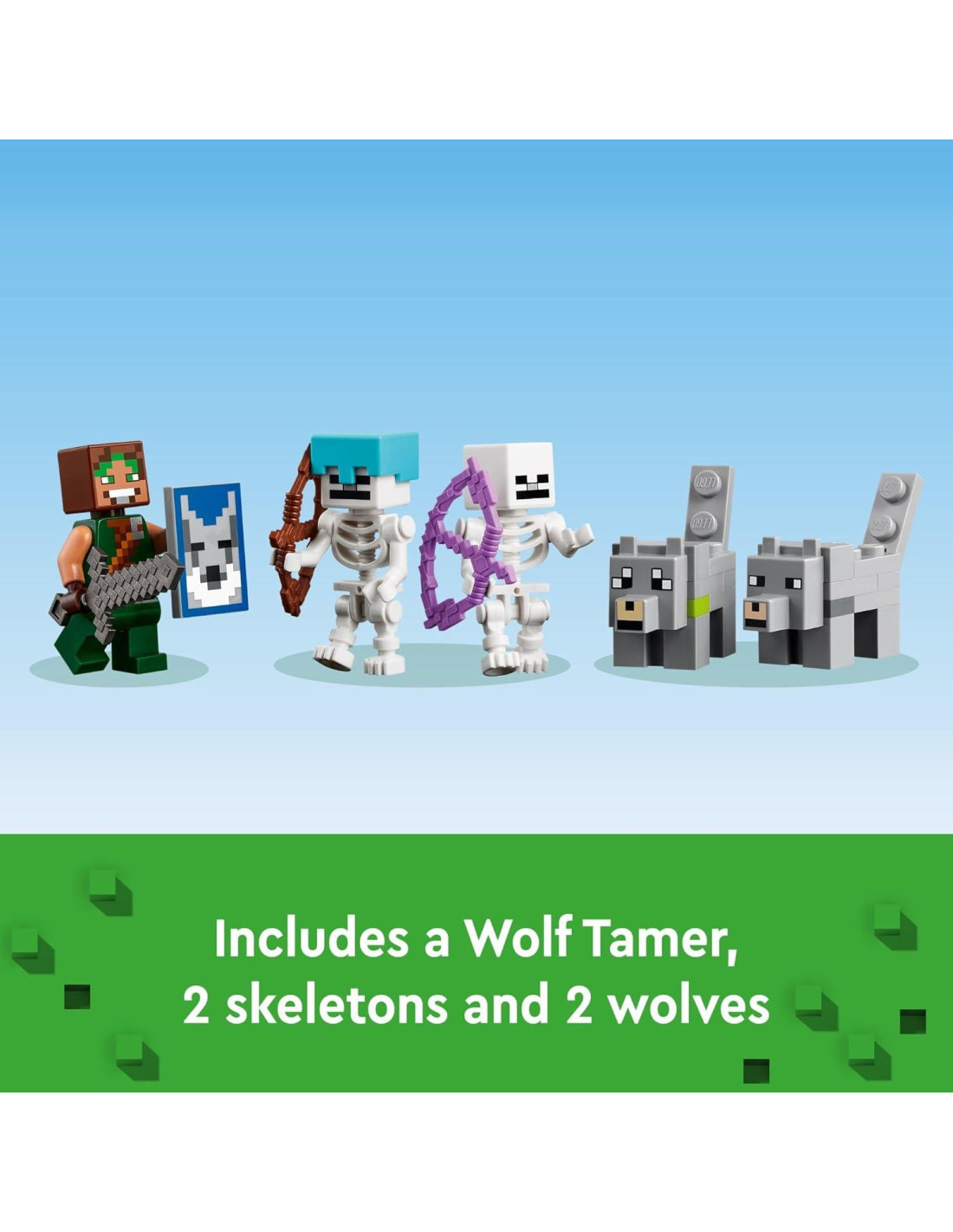 - Set de juego de castillo creativo - El juguete de video juego incluye una mesa de trabajo, un horno de explosión, un yunque y una mesa de herrería, además de una minifigura de LEGO Minecraft de un Domador de Lobos, 2 esqueletos y 2 lobos