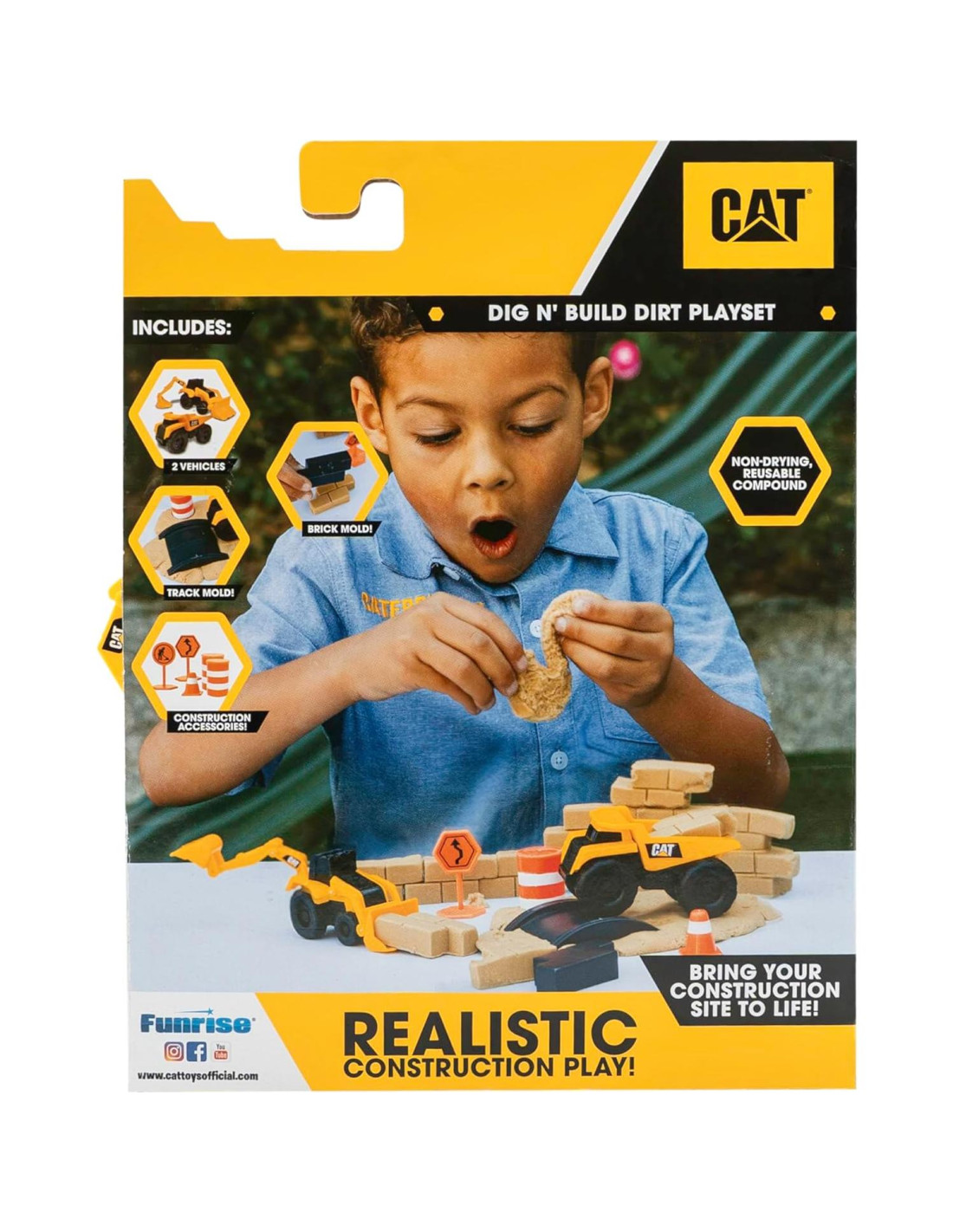 Presentamos el Juego de Tierra Dig N Build de Cat, la experiencia de construcción definitiva para pequeños constructores. Equipado con 2 vehículos de Maquinaria Pequeños, 10 oz (283,5 g) de compuesto de tierra premium, además de moldes y accesorios, los pequeños constructores pueden crear sus propios paisajes accidentados y zonas de construcción. Las verdaderas máquinas Cat son conocidas por su alta calidad y estos juguetes no son diferentes, diseñados para resistir los elementos y perfectos para jugar en interiores o exteriores. Apropiado para edades de 3 años en adelante.