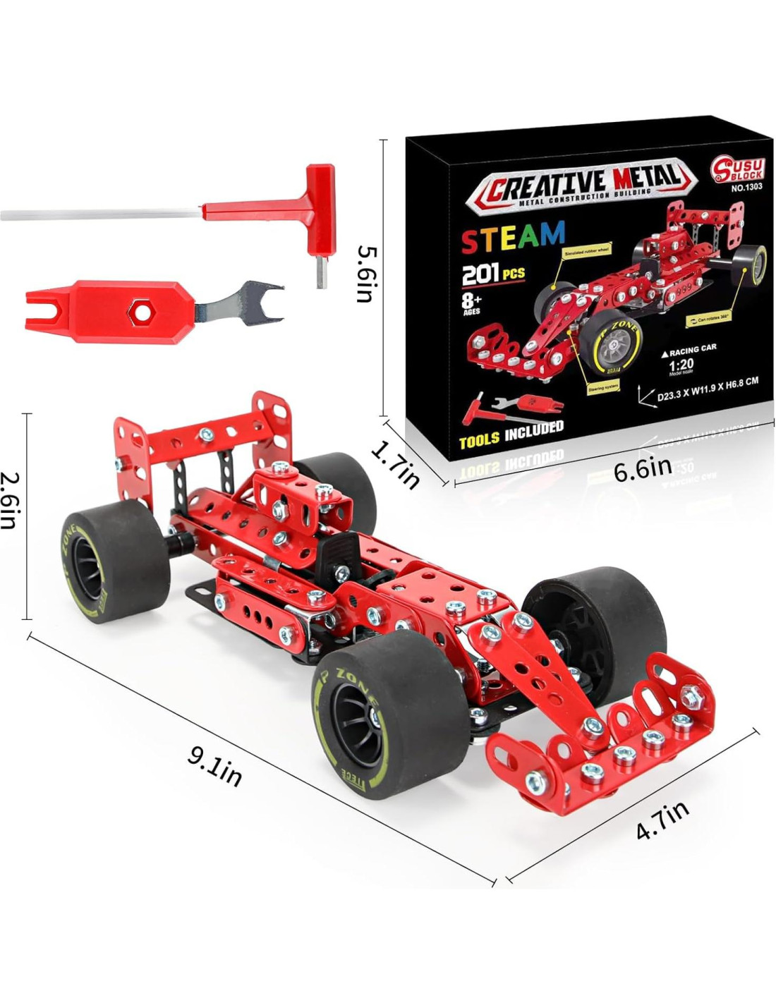 - Materiales Metálicos: El kit de modelo de coche de carreras incluye 201 piezas con tornillos, tuercas, destornilladores pequeños, llaves y más. El metal es resistente a la corrosión y de buena calidad, lo que lo convierte en un juguete de calidad para proyectos STEM.