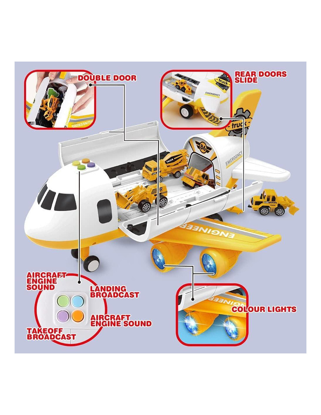 - SUPER VALOR: 6 Mini Camiones de Construcción y 1 Alfombrilla de Juego y 1 Juguete de Helicóptero y 11 Señales de Tráfico y Funciones en un Avión Transportador. Incluyendo Excavadora, Bulldozers, Mezcladora, Camión Volquete, Grúa, Transportador, y así sucesivamente.