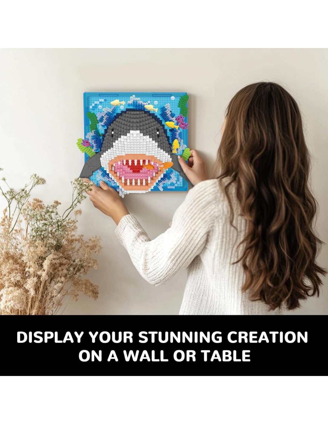 - Decoración Única: Este conjunto de construcción de tiburón tiene dos métodos de exhibición. Se puede colgar en la pared o colocar en la mesa. Es una decoración artística creativa y sobresaliente para la sala de estar, dormitorio, estudio, oficina u otro espacio, añadiendo un impacto visual de arte a cualquier lugar.