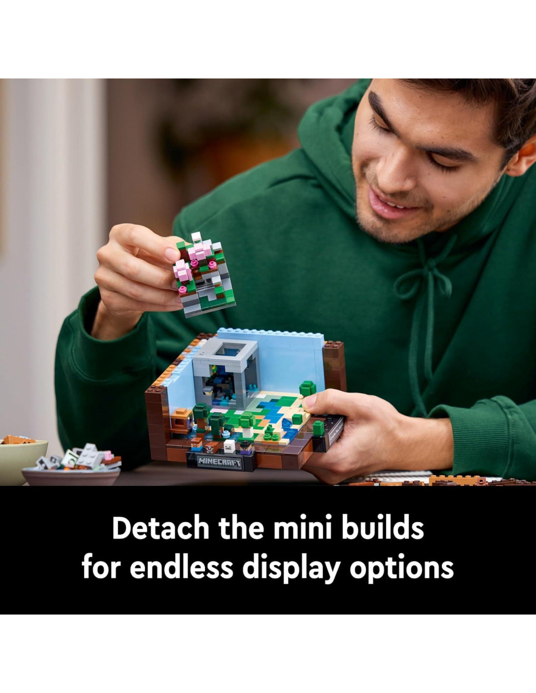 - Set de aventuras en biomas de Minecraft - Se representan 12 biomas: la Oscuridad Profunda, Cueva Exuberante, Pantano, Llanuras, Bosque, Bosque de Cerezos, Desierto, Taiga, Taiga Nevada, Cueva de Estalactitas, Picos de Hielo y Río