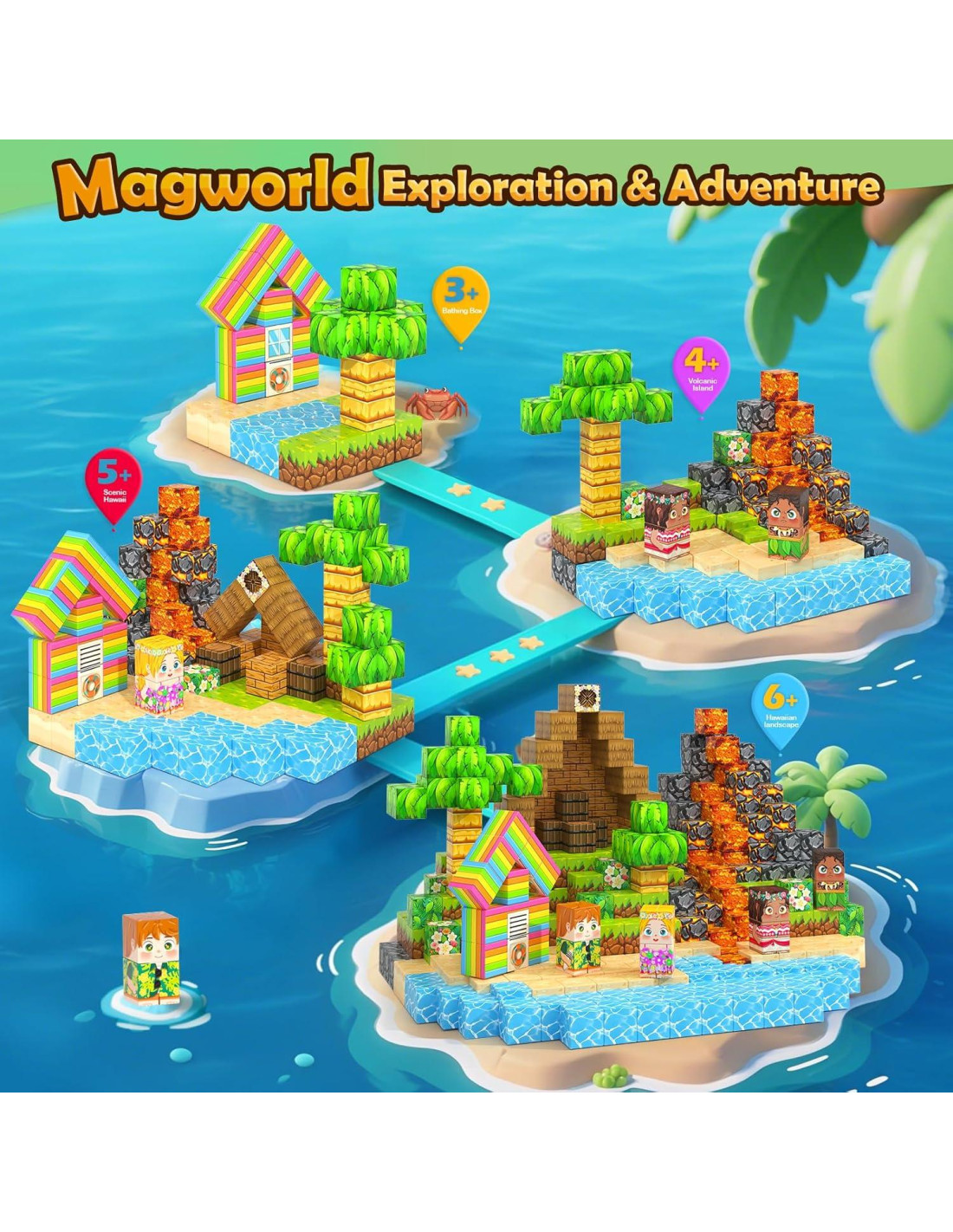 - [La Tribu se Encuentra con la Vida Relajada] ¿Qué sucederá cuando una princesa tribal se encuentre con niños y niñas blancos? ¡Cuenta su historia con este conjunto de bloques magnéticos de 120pcs! Presentando 19 diseños de cubos únicos inspirados en aventuras de verano, los niños pueden construir su propia isla de Hawaii y crear un MAGWORLD lleno de choques culturales, amistades y magia isleña!