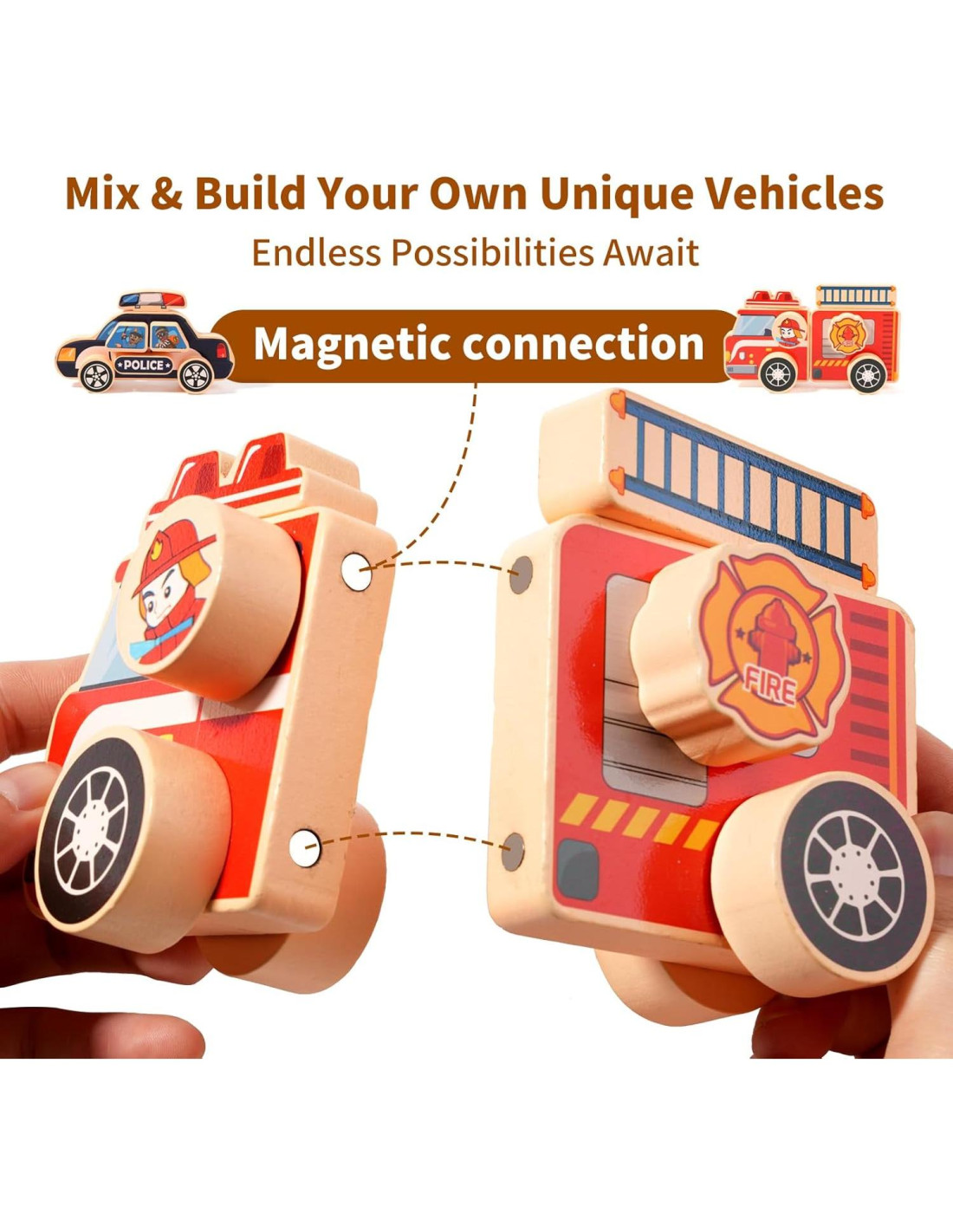 - Construcción Magnética Duradera para el Desarrollo de Habilidades: Con 34 piezas de madera intercambiables y un sistema de conexión magnética seguro para niños, este juguete STEM mejora las habilidades motoras finas, la coordinación mano-ojo y las habilidades de resolución de problemas mientras los niños ensamblan, desensamblan y personalizan sus vehículos de rescate.