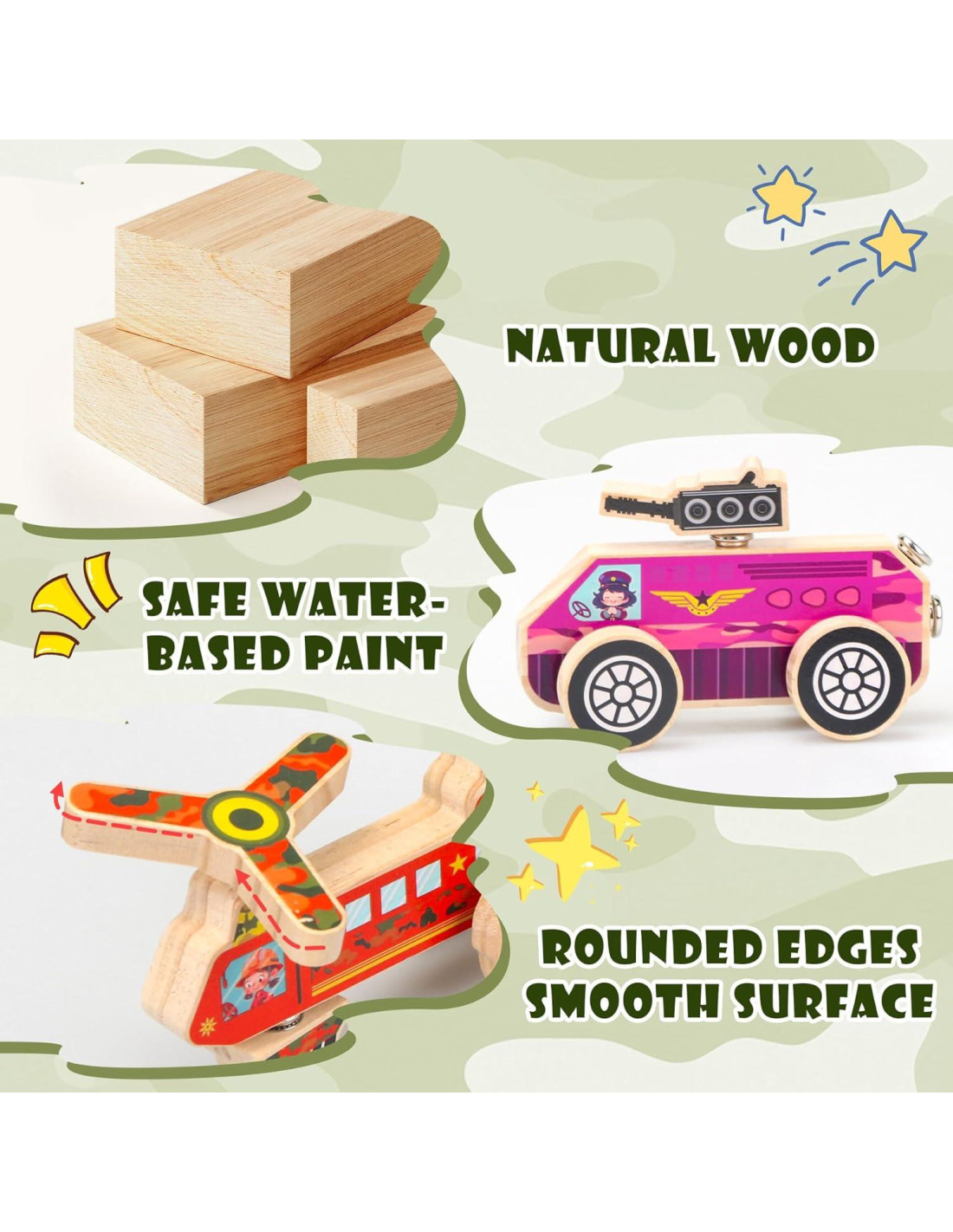 - Desarrolla los Sueños Militares de los Niños Este conjunto de juguetes Montessori de madera para niños de 3 a 6 años está compuesto por 33 piezas. Construcciones infinitas despiertan la imaginación. Las piezas encajables permiten a los niños mezclar camiones, tanques, aerodeslizadores y helicópteros libremente. Inventar nuevas máquinas y no hay límites para cómo los niños diseñan sus equipos de combate.