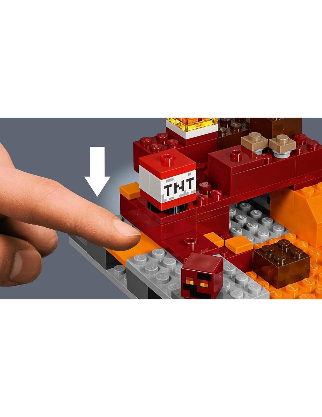 - Construye un escenario de LEGO Minecraft en el Nether con hongos y llamas construibles, y una función de explosión de TNT de Minecraft