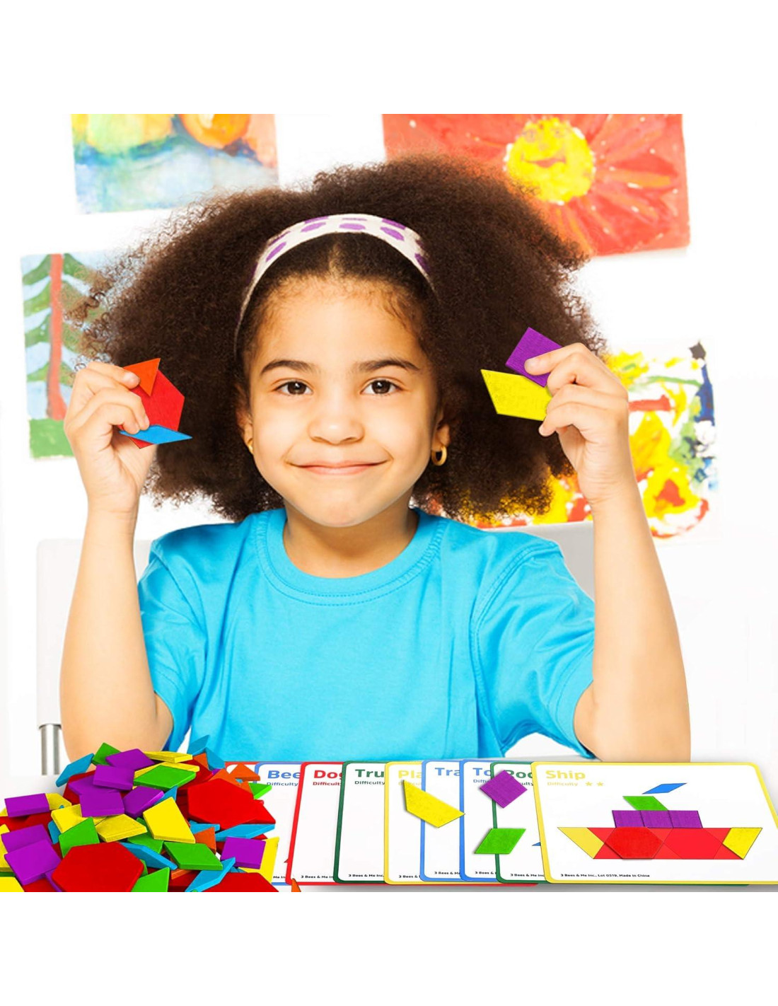- MONTONES DE FORMAS Y PATRONES - con 130 piezas de bloques de madera y 24 diseños para elegir, hay muchas formas para que los niños recreen un divertido diseño tangram o usen su imaginación para construir el suyo propio. ¡La bolsa de almacenamiento facilita mantener todas estas piezas organizadas!
