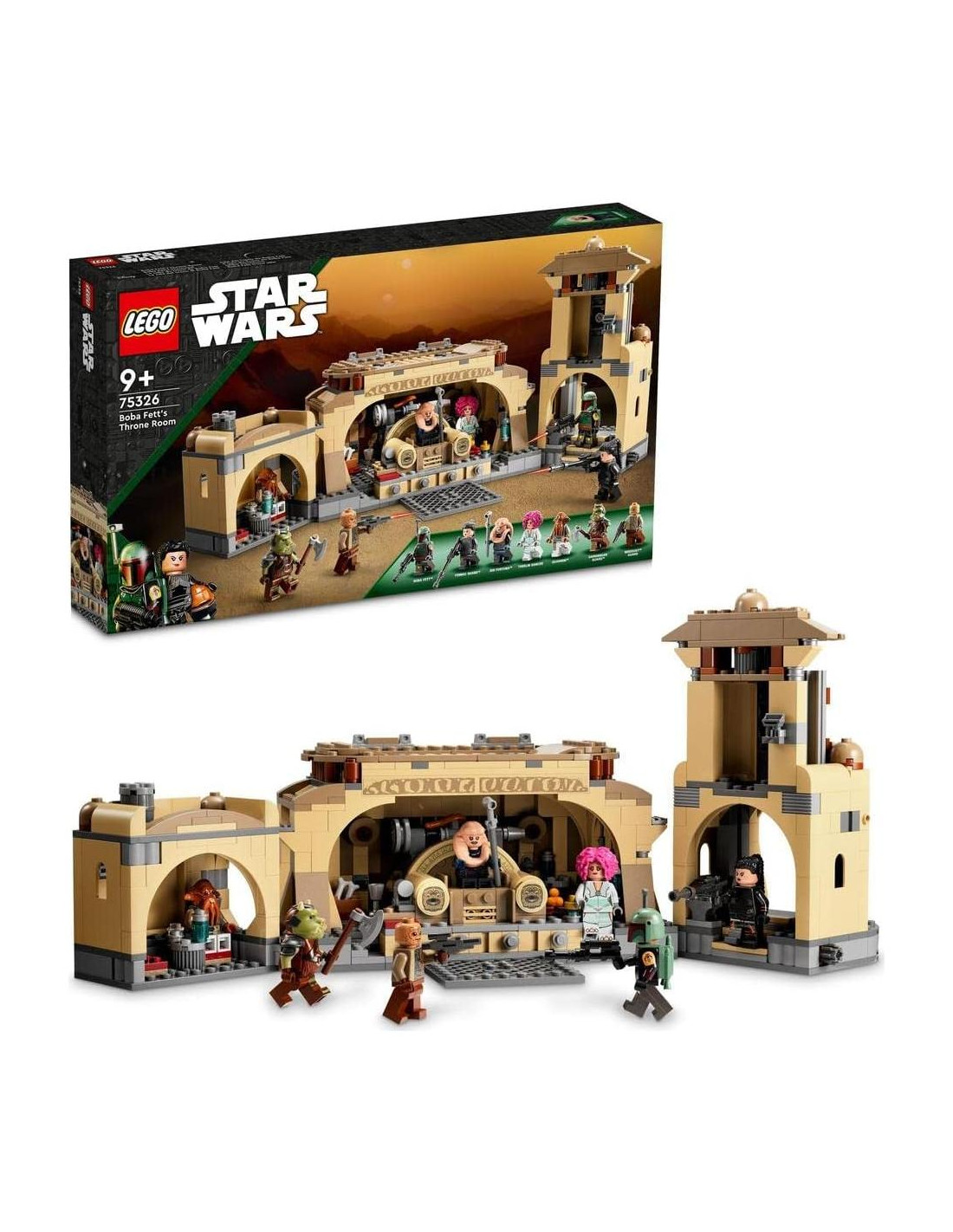 Comienza un nuevo capítulo de la saga construyendo el set de la Sala de Boba Fett (75326) de Star Wars: El Libro de Boba Fett para niños de nueve años y mayores. El modelo de bloques de construcción del palacio se puede abrir para acceder a la detallada sala del trono, cocina y área de barbacoa. Dentro hay un trono con compartimento de almacenamiento oculto y función de expulsión de Bib Fortuna, escalones inclinados, puerta de apertura y muchos accesorios de juego interesantes. Personajes Geniales Este popular set para niños incluye siete minifiguras de LEGO Star Wars. Estas incluyen a Bib Fortuna (nuevo para marzo de 2022), una bailarina Theeliana, guardián Weequay, guardián Gamorreano y Quarren con diferentes armas. Las instrucciones de ensamblaje detalladas se pueden encontrar en la caja y en la aplicación gratuita de Instrucciones de Construcción de LEGO. Galaxia llena de diversión El grupo LEGO ha estado creando modelos de naves espaciales, vehículos, lugares y personajes del universo de 'Star Wars' desde 1999. La amplia gama de sets de alta calidad deleitará a los fans de todas las edades.