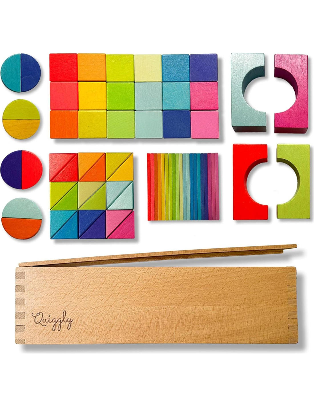 - Amado por Padres y Niños por Igual: Tanto los niños como los padres aprecian mucho los beneficios educativos y el diseño colorido y atractivo de los Bloques de Construcción de Arcoíris de Madera Quiggly Montessori.