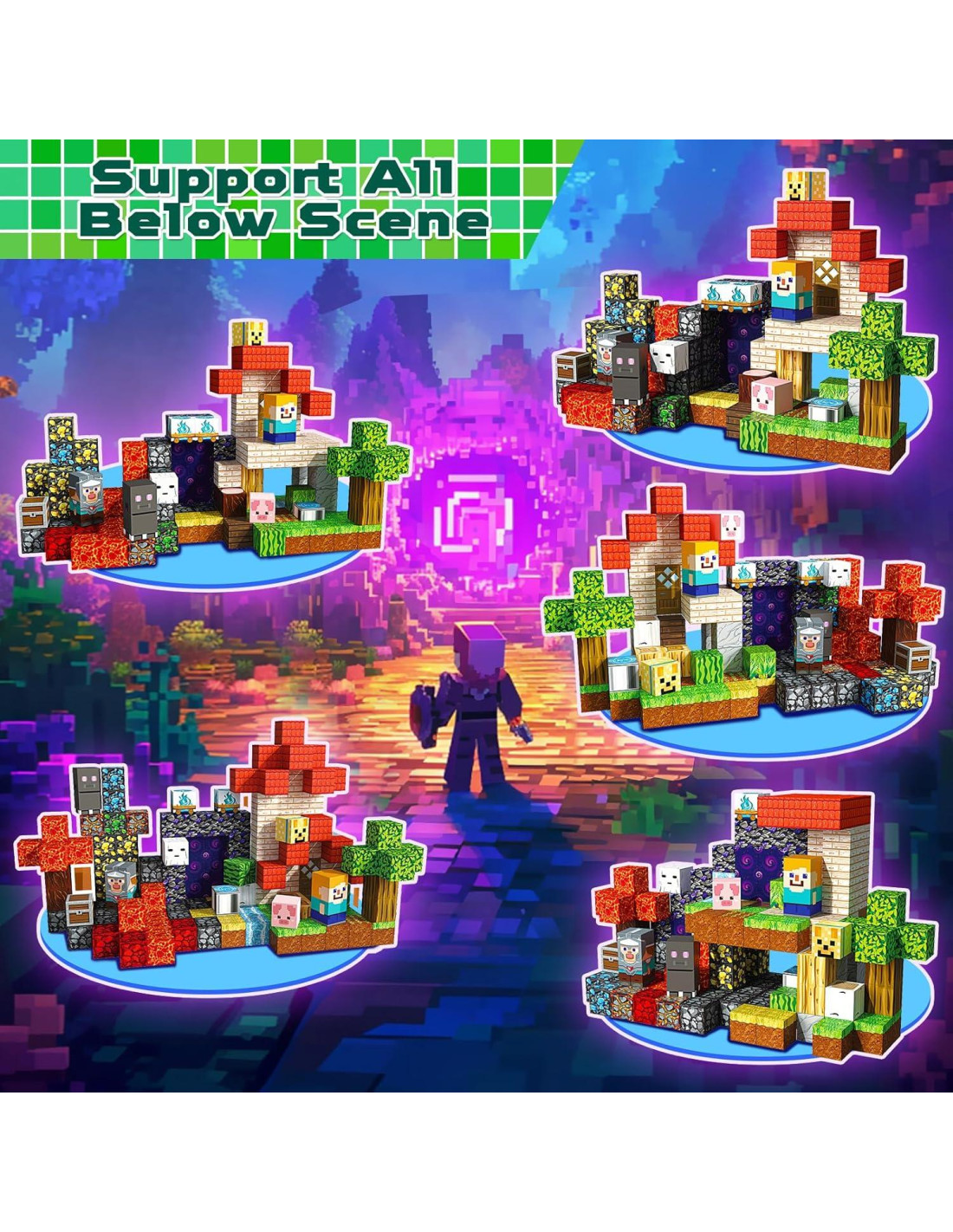 - 150 PCS Bloques Magnéticos para Construir 3 Mundos Únicos Este kit de bloques magnéticos despierta la creatividad con 3 mundos únicos para construir: una acogedora cabaña roja, flujos de lava burbujeante y un portal mágico. El folleto de ideas incluido combina narrativas, personajes y patrones creativos, empoderando a los niños para construir escenas guiadas o crear aventuras originales.