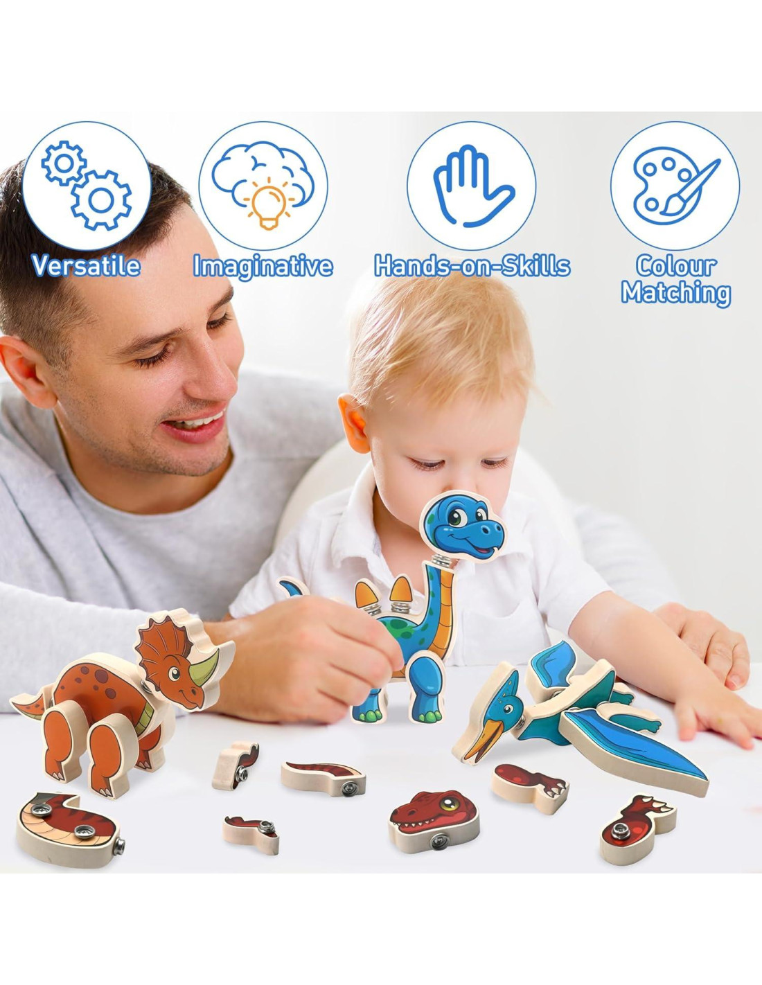 - Crea con constructores de dinosaurios de madera: Este juguete de construcción de dinosaurios de 30 piezas incluye cabezas, colas, patas y cuerpos que se ensamblan, permitiendo a los niños construir 4 dinosaurios completos. Con los constructores de dinosaurios de madera, los niños también pueden mezclar partes para diseñar nuevas y creativas criaturas.