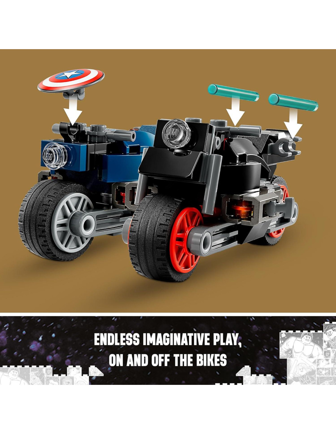 - Motocicleta de Capitán América - Ambas motocicletas tienen lanzadores laterales para defenderse de los villanos. Las minifiguras se pueden quitar fácilmente de las motos para expandir aún más las posibilidades de juego