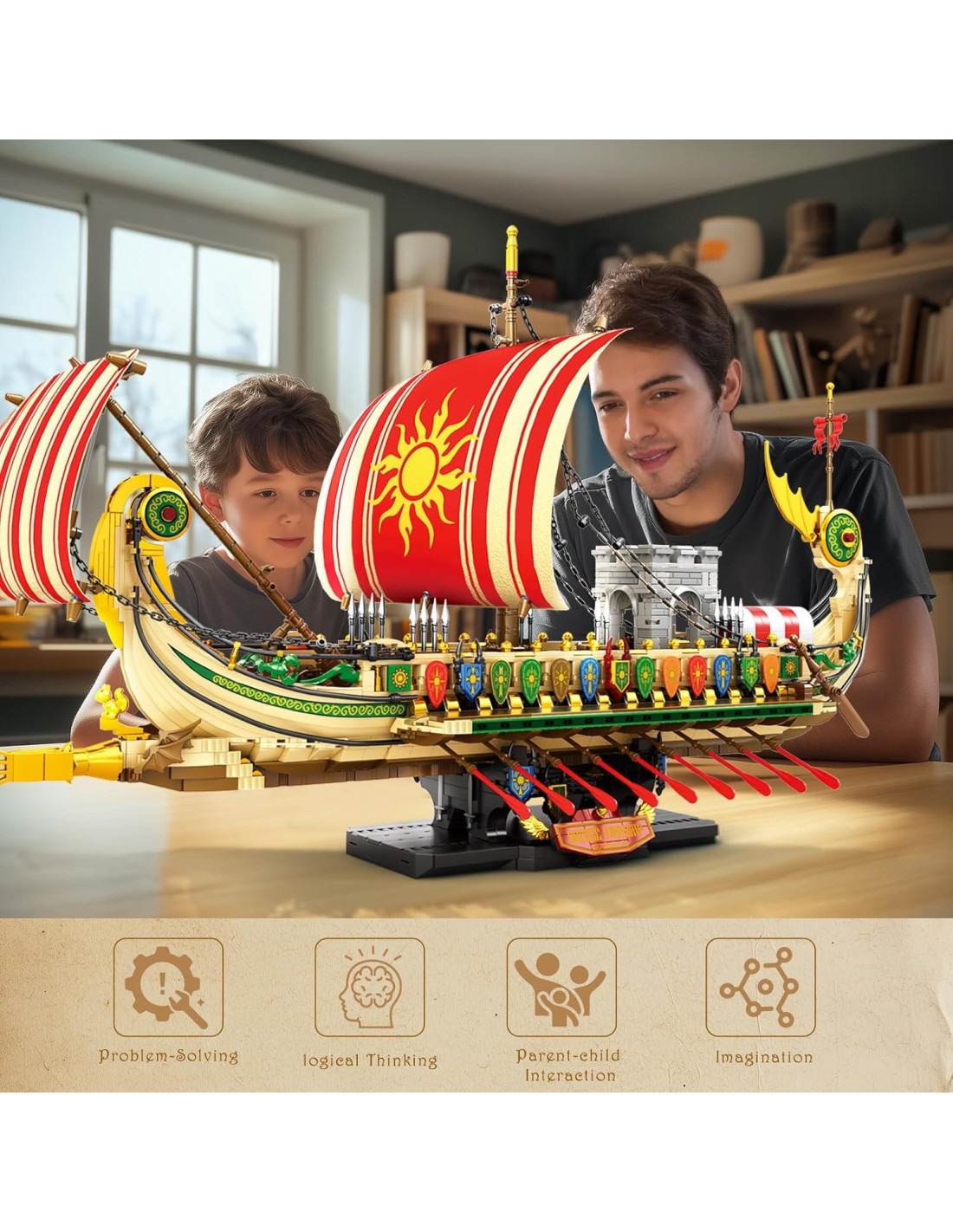 - [Kit de Exhibición Exquisito] Este buque de guerra griego está equipado con escudos y remos impresos exquisitamente en ambos lados del casco, que reproducen perfectamente los icónicos cuernos de bronce del buque de guerra griego, y utiliza velas de PVC de alta calidad, velas de terciopelo y partes chapadas en oro que aseguran la durabilidad y el impacto visual del modelo. La base exclusiva de bloques de construcción asegura la estabilidad del barco después del ensamblaje, haciéndolo adecuado para exhibición y colección