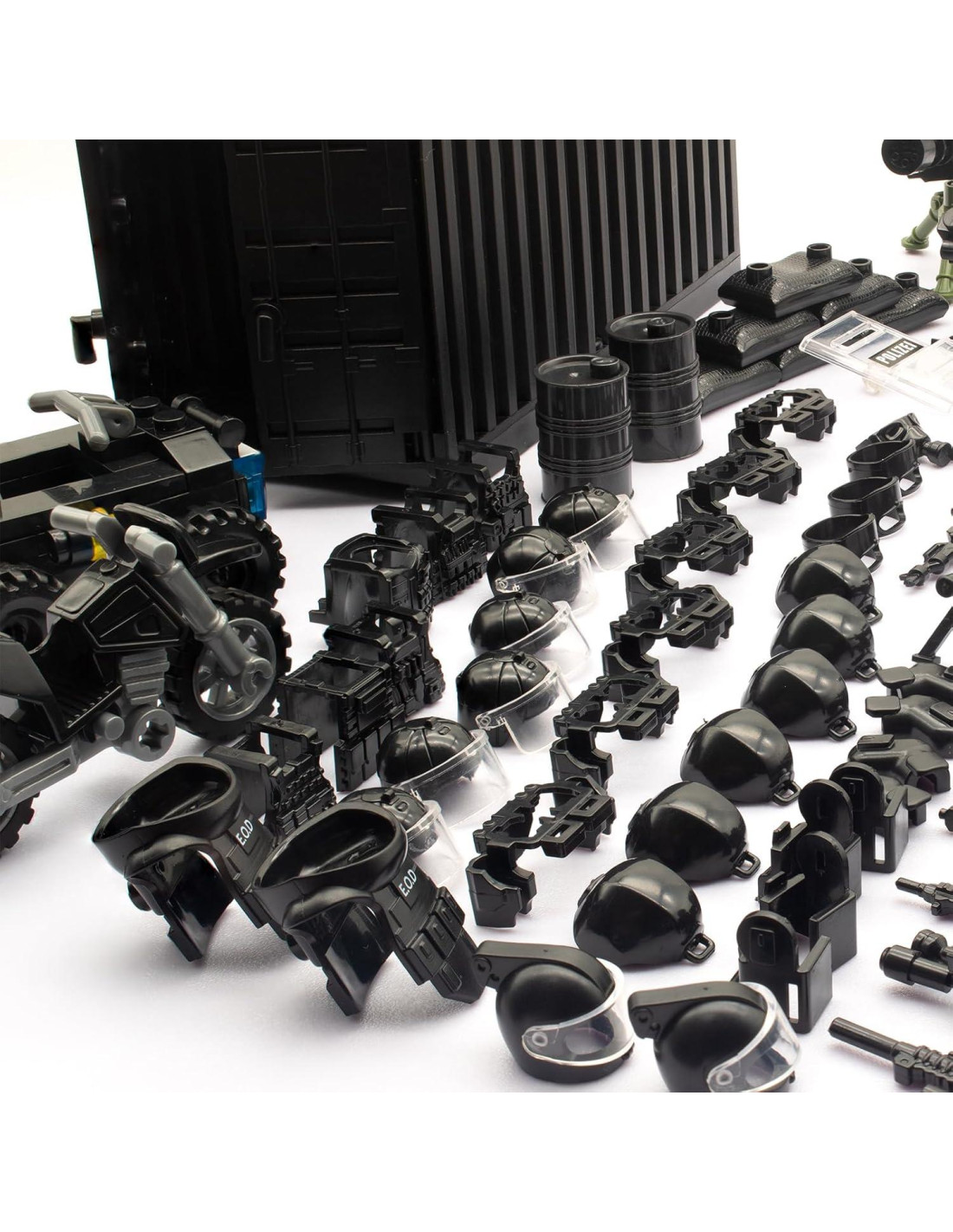 - [Paquete] : Accesorios de juguetes de paquete de armas de la serie SWAT como se muestra en la imagen, el contenedor negro sobredimensionado se utiliza para almacenar chalecos antibalas, cascos, mochilas tácticas, trajes de desactivación de bombas, escudos policiales, motocicletas policiales, múltiples rifles, etc. Una ametralladora, múltiples pistolas, dos cajas de armas de policía especiales negras, granadas, barriles de aceite, sacos de arena negros, morteros, ametralladoras Gatling, armas de aviación M2, etc., así como palas, alicates, bayonetas, linternas, hachas y otras herramientas, así como cuatrimotos policiales.