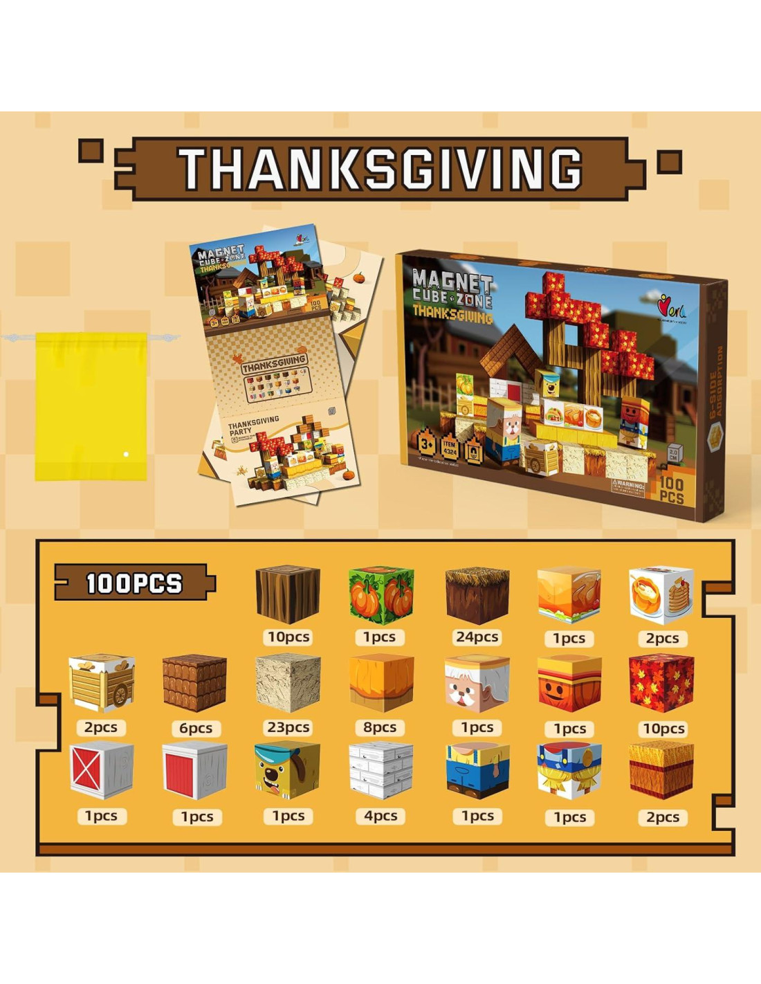 - 100 Azulejos Magnéticos con Tema de Acción de Gracias: Este conjunto de construcción festivo incluye 100 mini bloques magnéticos (cada uno de 1.98 cm), una bolsa de cuerda práctica y una guía de instrucciones. Lleno de vibras otoñales, está diseñado para inspirar creatividad y diversión práctica durante la temporada de Acción de Gracias