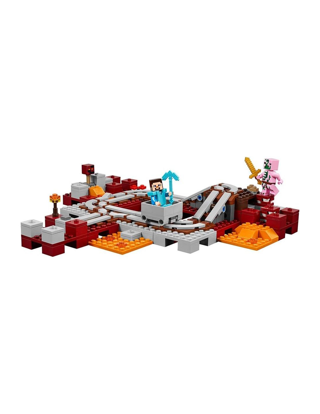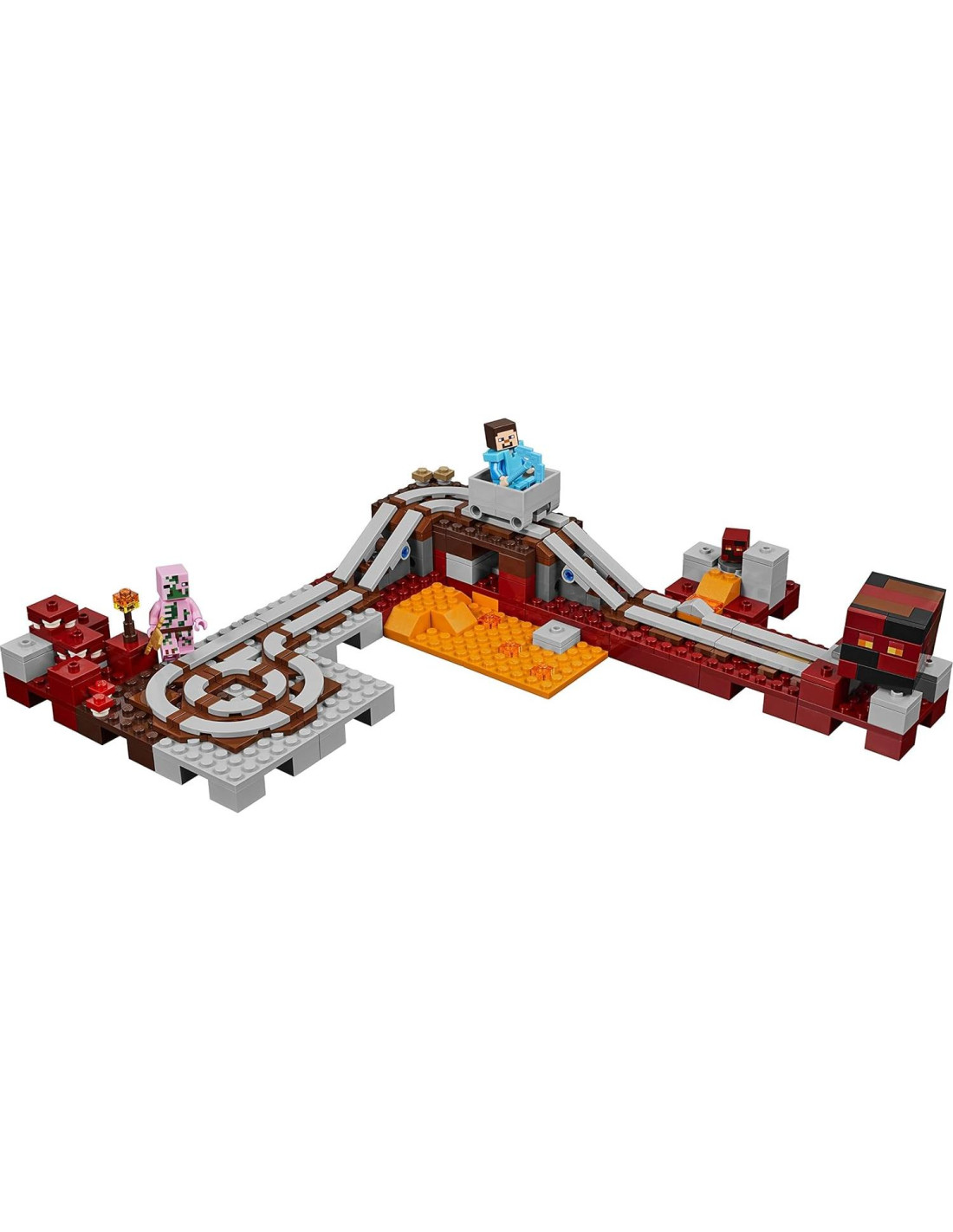 Construye un increíble sistema ferroviario y viaja a través del Nether. Evita la arena del alma, los cubos de magma saltarines y el Zombie Pigman mientras buscas valiosos minerales de cuarzo del Nether. Disfruta de aventuras prácticas de Minecraft con tus personajes y objetos favoritos con este LEGO Minecraft fácil de reconfigurar, modular, diseñado para jóvenes fanáticos del exitoso videojuego de mundo abierto. Incluye una minifigura de Steve Minecraft.