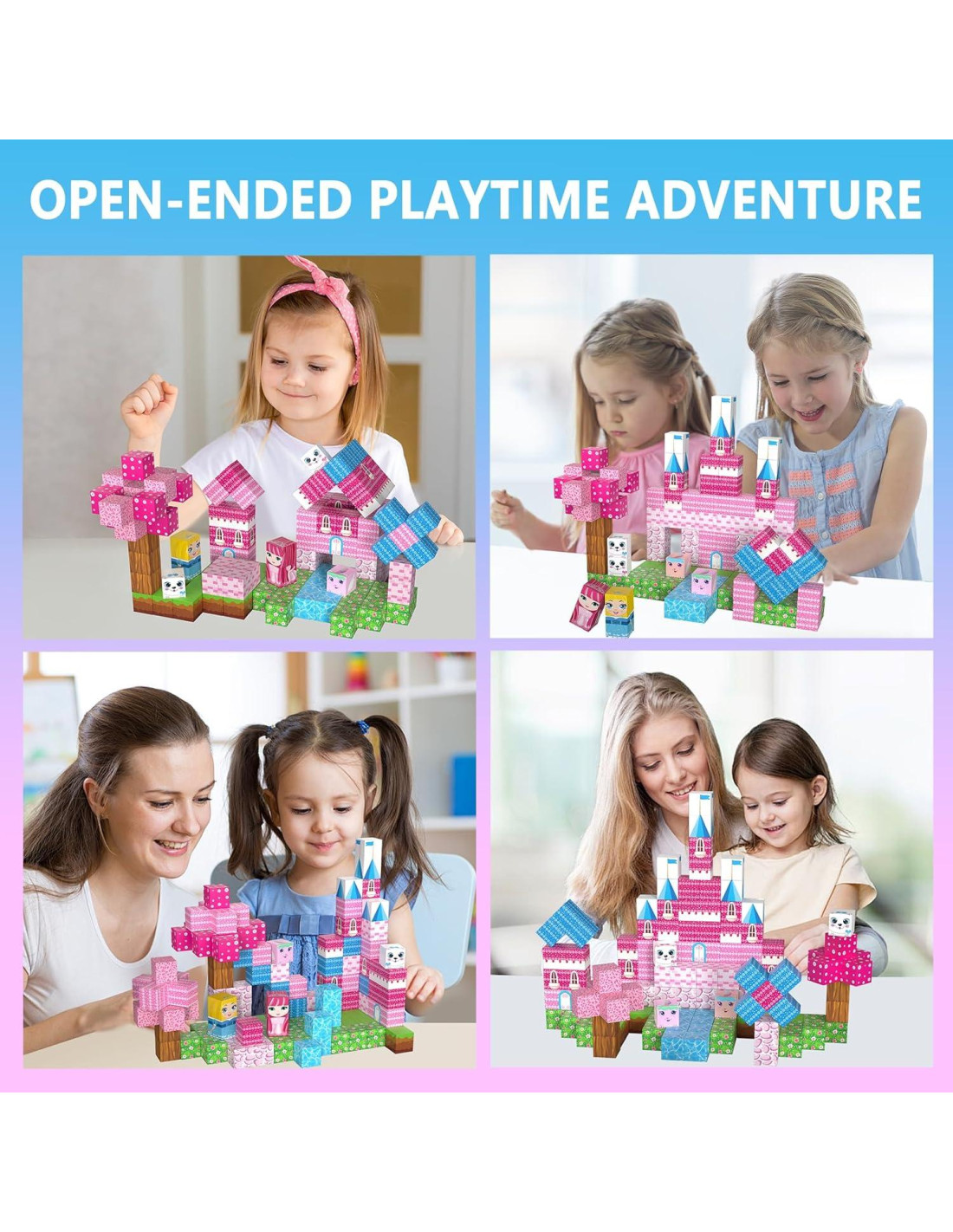 - [DISEÑOS DE CUBO VARIADOS] : Set de bloques de construcción magnéticos de 150PCS con temática de cuento de hadas, incluyendo elementos populares como princesa, gato, carroza de calabaza, etc. Los niños pueden construir varios edificios y crear un hermoso castillo de princesa rosa. El rico diseño de cubos puede estimular la creatividad y la imaginación de los niños.